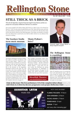 Und hier geht’s direkt zur Verlosung der drei von LUTZ MEINERT handsignierten und für die drei Gewinner mit einer Widmung versehenen Mediabooks (CD + DVD + 72seitiges, DVD-großes Buch mit dem kompletten 'Rellington Stone Magazin') von „Still Thick As A Brick“ des REFLECTION CLUBS: Gewinnspiel (Viel Glück!) mit Stichtag Sonntag, den 7. März