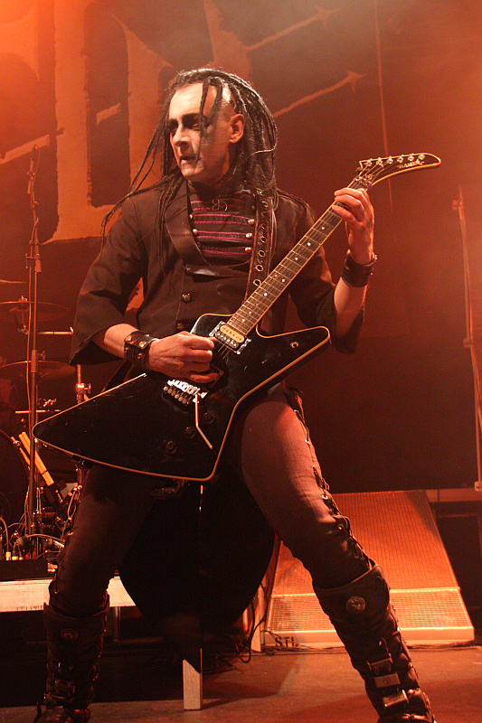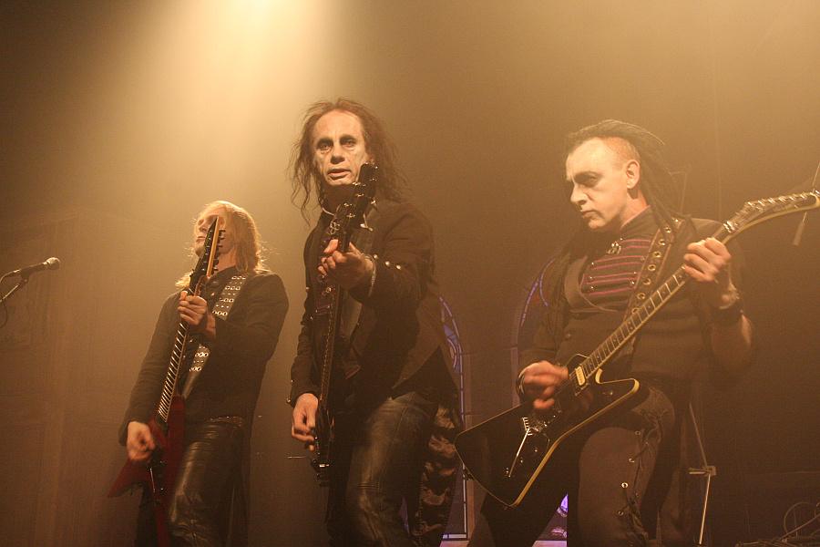 HellKurz vor 19.30 Uhr erklingt RAINBOWs "Long Live Rock 'n' Roll" in der Halle und gibt den Startschuss, wenige Augenblicke später erscheinen HELL auf der Bühne. Und zünden von der ersten Sekunde an ein Feuerwerk theatralischen Heavy Metals. Links und rechts auf der Bühne stehen Aufsteller mit beleuchteten Kirchenfenstern, die aber überaus unfromme Darstellungen zeigen. Eine gigantische Kanzel steht ganz links und wird im Verlaufe der Show auch zum Einsatz kommen. Die Mitglieder der Band, die ihre Anfänge zu Beginn der 80er hatte, sind fahl geschminkt und wirken, als kämen sie direkt aus Madame Tussauds Wachsfigurenkabinett, sind dafür aber enorm beweglich. Relativ unscheinbar auf der linken Bühnenseite bearbeitet Initiator Andy Sneap sein Instrument, optisch machen die beiden anderen Saiteninstrumentalisten einiges mehr her. Basser Tony Speakman sieht man am deutlichsten an, dass er nicht mehr der Jüngste ist, sein tief gefurchtes Gesicht sorgt in Kombination mit dem schütteren Haar für ein skurril-gespenstisches Gesamtbild. Mit seinen langen Dreads könnte Gitarrist Kev Bower dagegen auch bei den NINE INCH NAILS oder bei MARILYN MANSON mit auf der Bühne stehen, ohne negativ aufzufallen.
