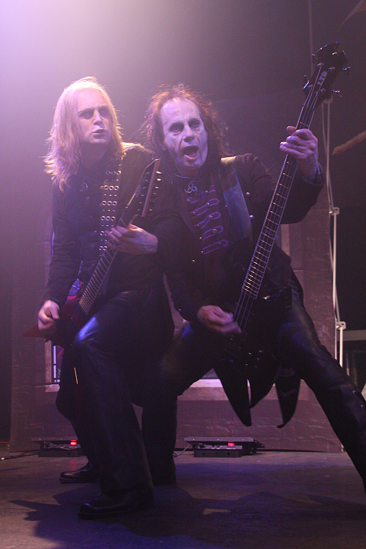 Das optische Hauptaugenmerk liegt aber auf Sänger David Bower, dem man deutlich anmerkt, dass er aus dem Theater kommt. Mit Stacheldraht-Krone auf dem Kopf, blutroten Kontaktlinsen in den Augen und Headset-Mikrofon stürmt er auf die Bühne und beeindruckt nicht nur mit einem außergewöhnlichen Gesang, sondern auch mit seiner lebendigen Performance, bei der er auch immer wieder mit dem Publikum interagiert. Es ist wirklich ein Hochgenuss, wie er mit Gesten und Mimik die Songs interpretiert. Zu "Plague And Fyre" kommt er mit Mönchskutte und schauriger Vogelskelett-Maske auf die Bühne, bei "Blasphemy And The Master" geißelt er seinen nackten Oberkörper mit einer Peitsche. Oder er springt in den Fotograben und legt den Zuschauern in der ersten Reihe die Hände auf, um eine Dämonenaustreibung vorzunehmen. Natürlich merkt man zu jeder Sekunde, dass das nichts anderes als großes, shakespearianisches Theater sein soll, das jedoch ist auch ganz großartige Unterhaltung. In den 45 Minuten, die HELL zur Verfügung stehen, kommen natürlich nur Songs des einzigen Album "Human Remains" zum Zug, die werden von der Band bei gutem Sound (bei dem es nur anfangs leichte Schwierigkeiten gibt) souverän gespielt. Zu einem perfekten Auftritt fehlen nur noch die Höllenfeuer-Pyros, aber die gibt es für eine Vorband natürlich nicht.