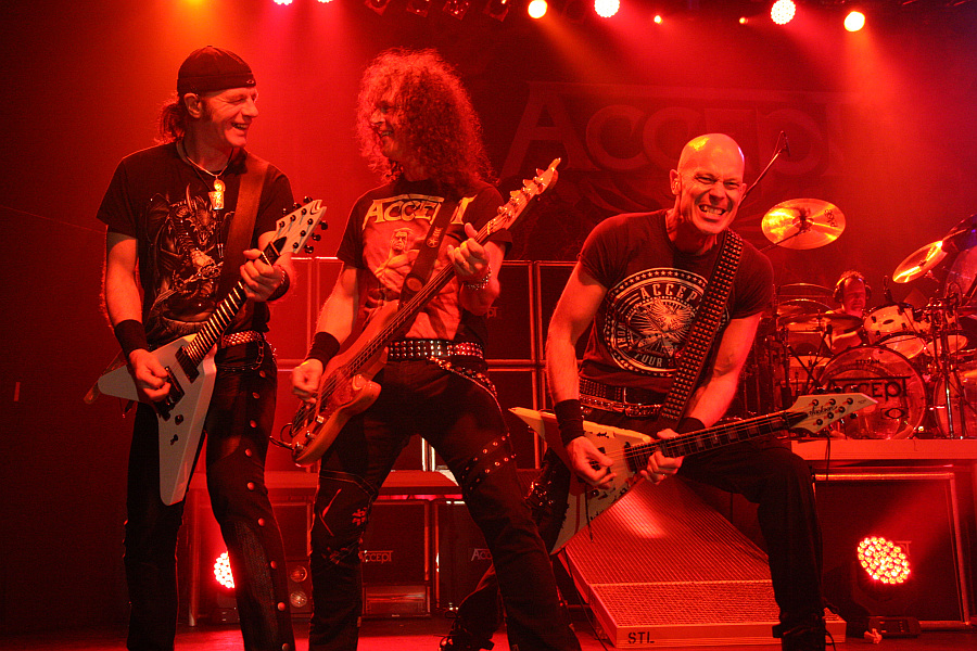 AcceptNach dem "Heaven And Hell"-Intro geht es - etwas überraschend - nicht mit "Hung, Drawn And Quartered", dem Opener des aktuellen Albums los, sondern mit "Hellfire", bei dem die Bühne passend in rotes Licht getaucht ist. Und sofort wird klar, was einen in den nächsten zwei Stunden erwartet. Ein Wolf Hoffmann an der Gitarre, der entweder wie ein Honigkuchenpferd grinst, Grimassen schneidet oder die typischen Posen mit Basser Peter Baltes zur Schau stellt. Die beiden sind die Aktivposten auf der Bühne. Der zweite Gitarrist Herman Frank erledigt seine Aufgabe etwas zurückhaltender, aber ebenfalls mit viel Spielfreude. Alle drei sind für charakteristischen Backing Vocals zuständig, die direkt im folgenden "Stalingrad" zum Zuge kommen. Sänger Mark Tornillo schwenkt in dem Song auch eine ACCEPT-Flagge, was ein bisschen übertrieben pathetisch wirkt, aber sei es drum. Das gehört bei ACCEPT eben auch dazu. Mit "Restless And Wild" folgt der erste Klassiker von 1982, vom gleichen Album folgen noch "Neon Nights", natürlich "Princess Of The Dawn" (mit gutem Bass-Solo) sowie als letzter Song des Hauptteils das famose "Fast As A Shark". Überhaupt ist die 21 Songs starke Setlist extrem 80er-lastig. Von "Breaker" (1981) gibt es den Titeltrack und "Son Of A Bitch", von "Balls To The Wall" (1983) natürlich den Titeltrack als allerletzten Song sowie "Losers And Winners" und von "Metal Heart" (1985) drei Songs: "Up To The Limit", "Living For Tonite" sowie den Titeltrack als erste Zugabe. Dazu wird der Löwenkopf, der früher das Logo zierte, hinter den Drums in die Höhe gehievt und leuchtet rot aus den Augen. Mit "Monsterman" und "Aiming High" vom "Russian Roulette"-Album von 1986 gibt es weitere Songs, die man nicht unbedingt auf der Rechnung hatte, zu hören. Ein einziger Song aus den 90ern wird gespielt, nämlich "Bulletproof" von der "Objection Overruled", bei dem sich Baltes und Hoffmann ein cooles Duell Bass Vs. Gitarre liefern. Auch bei solchen Aktionen spielen ACCEPT ihre Erfahrung voll aus, es wird nie übertrieben in die Länge gezogen (gleiches gilt für die Mitsingspielchen bei den üblichen Verdächtigen), darf aber auch nicht fehlen. Seinen großen Einzelmoment hat Hoffmann nach "Shadow Soldiers" vom neuen Album, das jetzt schon als Liveklassiker gesehen werden darf. Fehlen nur noch die Songs vom Comebackalbum "Blood Of The Nations", davon werden - auch etwas überraschend - "Pandemic", "No Shelter", "Bucketful Of Hate" und natürlich "Teutonic Terror" als zweite Zugabe gespielt.