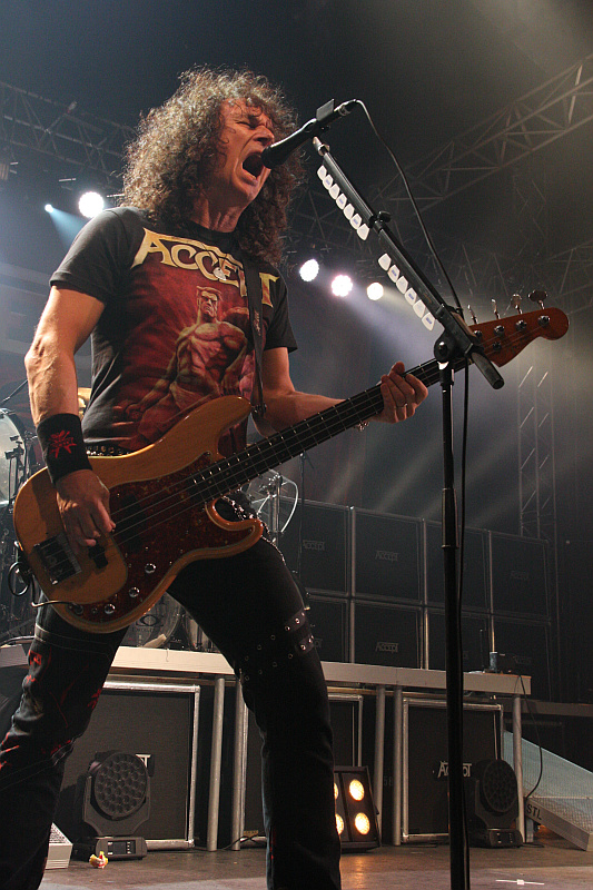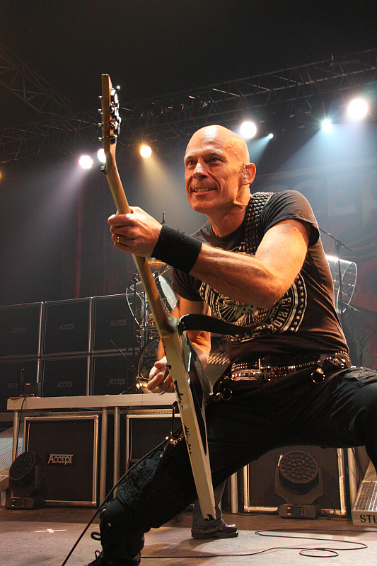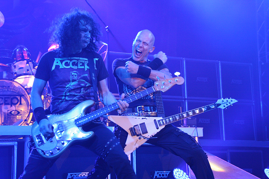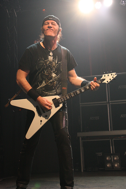 AcceptEine halbe Stunde dauert die Umbaupause, dann stehen ACCEPT auf der Bühne. Und werden in den kommenden zwei Stunden beweisen, dass sie gefahrlos eine starke Vorband wie HELL mit auf Tour nehmen können, wohl wissend, dass man da noch locker einen draufsetzen kann. Im Hintergrund prangt ein großes Backdrop mit dem bunten Cover der "Stalingrad"-Platte (das ja nur eine Notlösung darstellt), davor erhöht das transparente Drumkit von Stefan Schwarzmann mit fettem Gong im Hintergrund und zwei riesigen Toms links und rechts. Vor den Drums ist eine kleine Fläche, auf die die Musiker über zwei Stege links und rechts kommen. Und wie es sich gehört, zieren insgesamt 27 Boxen mit ACCEPT-Logo das Bühnenbild. Das sieht laut aus und laut sind ACCEPT auch an diesem Abend. Viel zu laut ist zunächst der Drumsound und es dauert einige Zeit, bis man das in den Griff bekommt. Ab dann ist der Sound auch ausgewogen, aber in der Tat so laut, dass Ohrenstöpsel an diesem Abend dringend angebracht sind.