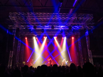 Gitarre schließlich blutbeflecktes Zeugnis von ihrem Willen ablegt, bis zum Ende der Zeremonie nicht locker zu lassen. Der Auftritt wirkt insofern auf eine Weise entrückt, die mir sehr behagt – es ist ein unvermitteltes Eintauchen in eine andere Welt, ähnlich wie in Kindertagen mit einem spannenden Buch, bei dessen Lektüre man die Zeit und die ganze Welt um sich herum vergaß. Ob die Musik an einem anderen Ort wohl noch intensiver wirkt? Unweigerlich muss ich an die Ruine einer alten Munitionsfabrik im Wald denken, die ich unlängst besucht hatte... und auch weite Teile des Publikums werden in den Bann gezogen, denn die Halle füllt sich trotz der noch recht frühen Stunde beachtlich.