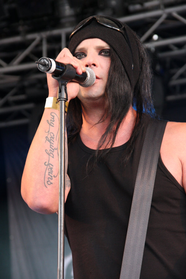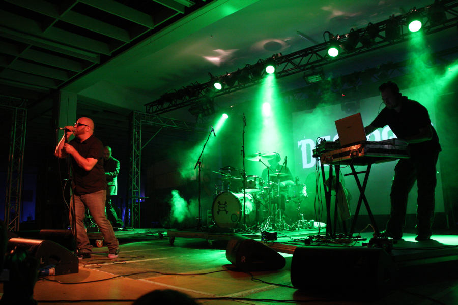 Outfit, so hätte diesen Sänger Sven verdient, denn seine Optik mit kurzer Turnhose, Trainingsjacke, Nerd-Brille und türkiser Stratocaster-Gitarre ist schwer geschmacklos. Geschmackvoller dagegen der Sound, den er mit Partnerin Claudia macht, denn die Mischung aus Electroclash, Synthiepop und Wave geht gut ins Ohr. Im Staatenhaus geht es mit intelligentem Electro der Extraklasse weiter, denn DESTROID, die Band um ex-Haujobb-Frontmann Daniel Myer ist an der Reihe. Während man letztes Jahr beim Blackfield Festival lediglich mit einem Computer antrat, sind dieses Jahr gleich zwei Herren für die synthetischen Klänge zuständig, dazu gibt es echte Drums. So wird die Show mit Songs wie "Silent World", "Judgement Throne" und dem The Sisters Of Mercy-Cover "Lucretia My Reflection" musikalisch zum ersten Highlight an diesem Nachmittag, auch dank Myers agiler Bühnenshow.