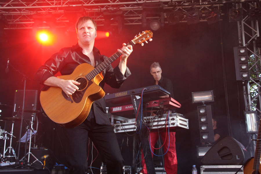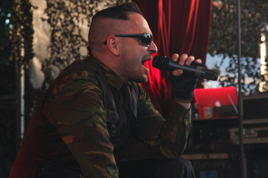 70 Minuten akustischen Ohrenschmaus gibt es dann mit ANNE CLARK auf der Hauptbühne. Die Grande Dame des Wave und ihre enorm talentierte Band intonieren die 16 Songs mit Cello, Piano, Gitarre, Keyboards und Drums äußerst gefühlvoll, rocken aber gleichzeitig mitunter ordentlich drauf los. Währenddessen steht Anne oft mit geschlossenen Augen am Mikrofon und lässt ihre Aura aufs Publikum ausstrahlen, das bei Hits wie "Our Darkness" und "Sleeper In Metropolis" ausgelassen tanzt. Ältere Songs wie "Abuse", "The Haunted Road", "Short Story" und "Echoes Remain Forever" wechseln sich mit aktuellen Stücke vom wunderbaren "The Smallest Acts Of Kindness"-Album ab und lassen den Auftritt zu einem Genuss werden. Als Headliner auf der Hauptbühne beglückt Steve Naghavi seine Krieger und Schlampen, wie auf den käuflich zu erwerbenden AND ONE-Shirts zu lesen ist und verbrät passend zu seinem Soldatenlook mit Deutschland-Fähnchen auf dem Arm gleich am Anfang die