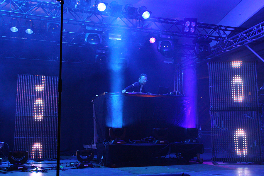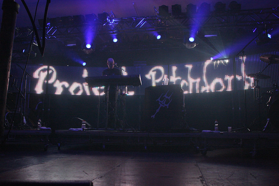 Bevor es für den Schlussact wieder zurück ins Staatenhaus geht, ist frische Luft schnappen angesagt. Dabei hört man ein paar Töne des Headliners auf der Hauptbühne, nämlich AND ONE, deren Frontmann Steve Naghavi jedoch gesundheitlich angeschlagen ist, was man seiner Stimme deutlich anhört. Wie üblich spielen AND ONE auch "Timekiller", den größten Hit von PROJECT PITCHFORK, die im Staatenhaus für ein würdiges Ende des Amphi Festivals sorgen. Optisch hat man mit großer LED-Aufwand ordentlich aufgefahren, zudem gibt es gleich zwei Schlagzeuge auf der Bühne. Die Beats werden tatsächlich von zwei Drummern komplett live gespielt, was einen interessanten, lebendigen Sound erzeugt. Dafür gibt es keine Live-Gitarre mehr, seit Carsten Klatte ausgestiegen ist. Sänger Peter Spilles sieht mit Zottelfrisur und blau-weißer Farbe im Gesicht aus wie immer und krächzt genauso unvergleichlich wie immer ins Mikrofon, erweist sich zudem wieder als agiler und souveräner Frontmann. Musikalisch gibt es einen Querschnitt durch das gesamte Schaffen der Band, angefangen bei "K.N.K.A." bis hin zu Songs des aktuellen Albums "Quantum Mechanics", gekrönt natürlich vom recht früh gebrachten "Timekiller", "Steelrose", "Fire & Ice" und "Souls".