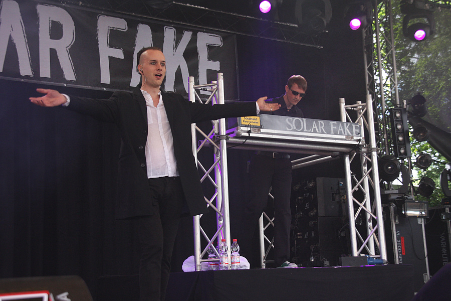 Weiter geht es auf der Hauptbühne dann mit SOLAR FAKE. Sven Friedrich, ansonsten Sänger bei ZERAPHINE, ist zum zweiten Mal mit seinem Electro-Projekt beim Amphi Festival am Start und präsentiert mit seiner angenehmen Stimme zum größten Teil Songs seines zweiten Albums "Frontiers", die ein bisschen härter ausfallen, als das Material des Debüts "Broken Grid", von dem nur das schöne "Here I Stand" gespielt wird. Dazu tänzelt er wie immer gut gelaunt über die Bühne und bekommt reichlich Applaus vom Publikum.