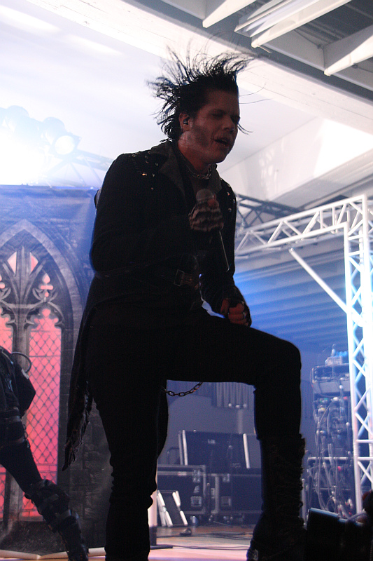 Im Staatenhaus ist es zunächst erschreckend leer, als WHISPERS IN THE SHADOW in ihr Set starten. Offenbar sind nicht allzu viele Besucher mit der österreichischen Band, die schon sieben Alben veröffentlicht hat, vertraut. Frontmann Ashley Dayour kommt mit Huf auf die mitunter grell beleuchtete Bühne und begleitet die Songs mit ausdrucksstarker Mimik und Gestik. Auch die anderen Musiker an Bass und Gitarre sind sehr agil und legen sich ins Zeug, der recht harte, gleichzeitig atmosphärische Gothic Rock ist jedoch für das müde Publikum eher schwer verdaulich. Dementsprechend begrüßt der Sänger die Zuschauer lakonisch zur "breakfast show", die aus acht Songs besteht. Letztlich kann man der Band jedoch keinen Vorwurf machen, denn der Auftritt ist insgesamt recht gelungen, auch wenn das Songmaterial ein bisschen Unverkennbarkeit vermissen lässt.