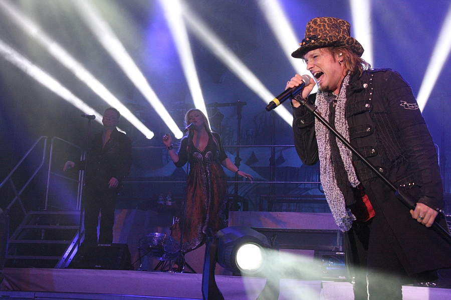 Und zwar mit einer kleinen Sensation, denn es dürfte ein paar Jährchen her sein, dass der ehemalige HEAVENS GATE-Gitarrist und langjährige AVANTASIA-Hofproduzent Sascha Paeth mit einem Leadsänger namens Thomas Rettke auf der Bühne stand. Der ehemalige HEAVENS GATE-Fronter steht nämlich nicht nur als Backgroundsänger neben Amanda Somerville, sondern übernimmt bei einigen Songs auch den Hauptgesang. Wie dem brettharten "Scales Of Justice", das im Original von Ripper Owens gesungen wird und bei dem Rettke zeigt, dass er stimmlich auch 2013 noch so einiges drauf hat. Danach wird der Knüppel aber wieder eingesteckt und die erste Ballade des Abends wird ausgepackt. Wie auch auf dem Album wird "What's Left Of Me" von MR. BIG-Frontmann Eric Martin angestimmt. Der wird seinem Ruf als ausgezeichneter Sänger jedoch nicht auf Anhieb gerecht, denn von allen bisherigen Frontleuten kann er zunächst am wenigsten überzeugen, beim flottmelodischen "Promised Land" von der "Angel Of Babylon"-Scheibe kommt aber auch er besser in Form. Oder ist sein Mikrofon nicht ordentlich eingestellt? Man weiß es nicht. Etwas überraschend entpuppt sich Martin aber auch als kleiner Zotenreißer und versucht, das Publikum mit seinen Witzchen bei Laune zu halten. Danach hat Frau Somerville ihren ersten großen Auftritt und zelebriert mit Tobi das wunderbar poppige "Sleepwalking", bevor Ronnie Atkins im superben "The Scarecrow" zeigt, dass er ein guter, aber nicht perfekter Ersatz für Jorn Lande ist, der diese Tour nicht mitfahren konnte. (ASZ)