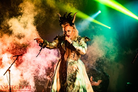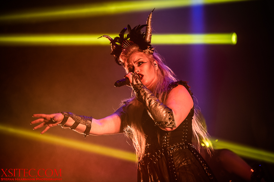 BATTLE BEAST haben sich ihrerseits auch nicht lumpen lassen und eigenes Bühnenlicht mit nach Bochum gebracht. Zusätzlich stehen auf der Bühne farbig illuminierte Nebelfontänen, die der Show zusätzliche Effekte verleihen. Noora Louhimo glänzt mit eindrucksvollem Gesang, der druckvoll und voller stimmlicher Facetten ist. Die Frontlady scheut sich auch nicht, die teilweise schwindelerregenden Tonhöhen, bei der viele ihrer Kolleginnen schlicht passen müssten, auch „Live“ auf die Bühne der Zeche zu bringen.
