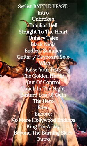 Noora zeigt sich bestens aufgelegt und feuert einen Titel nach dem anderen in die begeisterte Menge. Mit „Eden“ beschließen BATTLE BEAST das reguläre Set, aber nach frenetischem Jubel gibt es als Zugabe noch den Titel-Track des neuen Albums, „King For A Day“ vom „Bringer Of Pain“-Album und zu guter Letzt „Beyond The Burning Skies“ auf die Ohren. Danach folgt das obligatorische Abschlussfoto mit der feiernden Menge im Hintergrund.