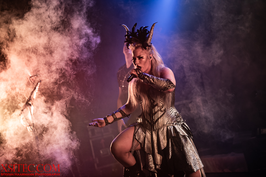 Nach einem Intro, das Drummer Pyry Vikki allein gehört, kommen Noora und ihre Jungs auf die Bühne der Zeche. Routiniert wird das verpatzte Intro zu „Unbroken“ kurzerhand noch einmal neu gestartet und ab diesem Zeitpunkt gibt es kein Halten mehr für die BEASTer, die ab der ersten Minute Vollgas geben, als ob der Leibhaftige selbst hinter ihnen her wäre. Noora, die, wie sie mir im Interview verriet, auf der Bühne immer unter Strom steht, saust von einer Ecke der Bühne zur anderen und hat sichtlich Spaß an ihrem Job.
