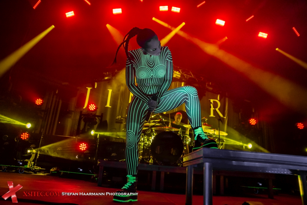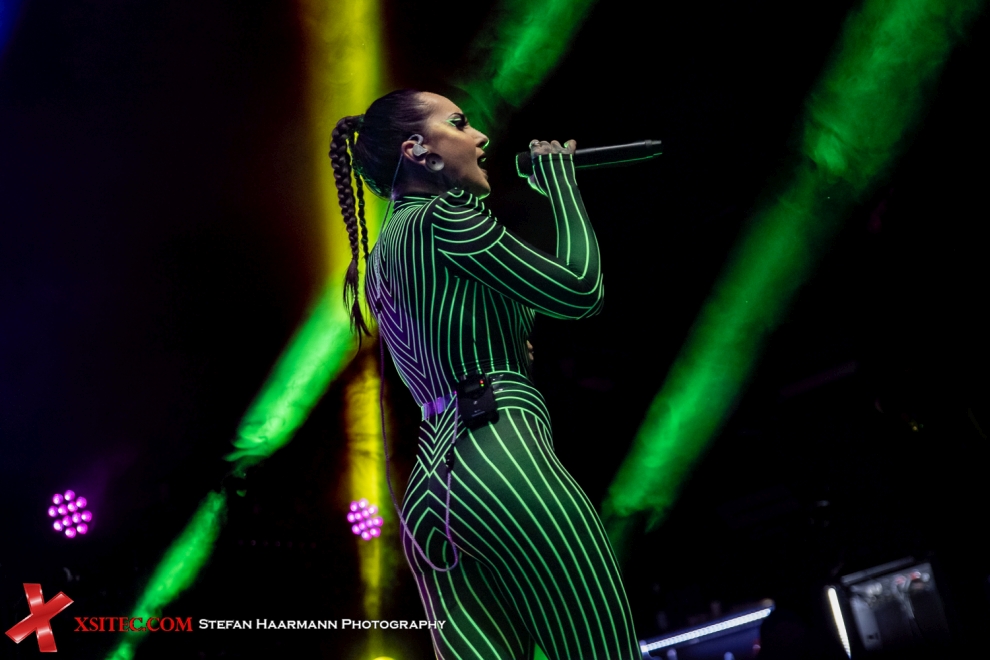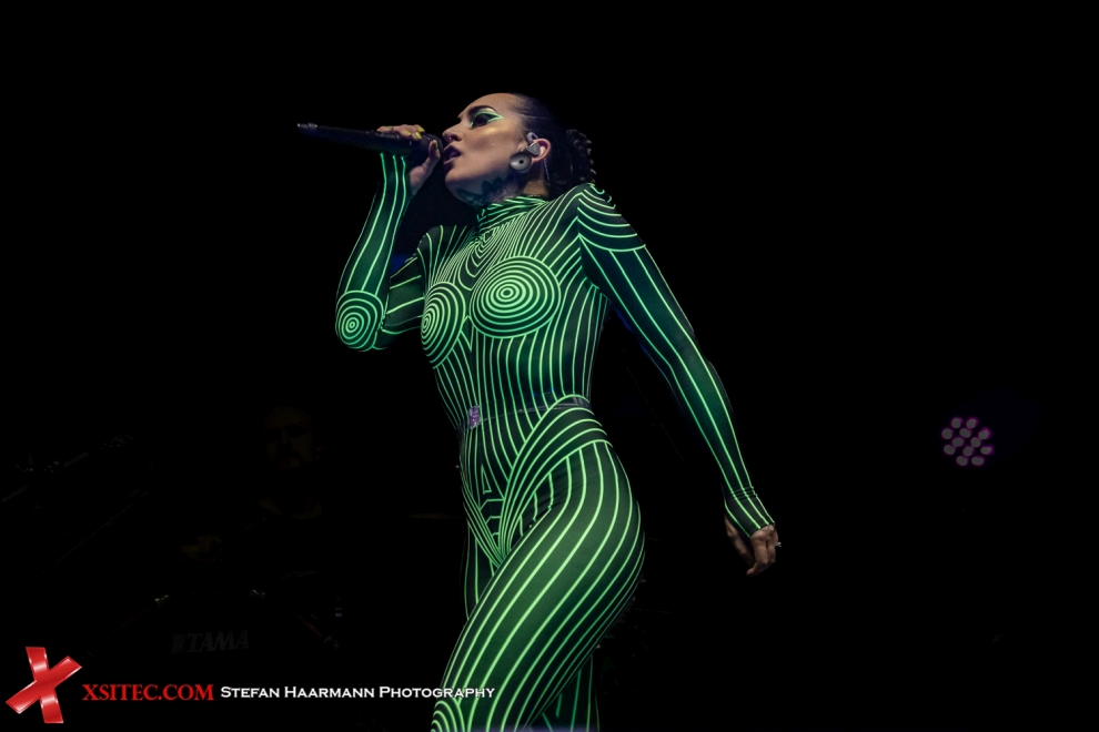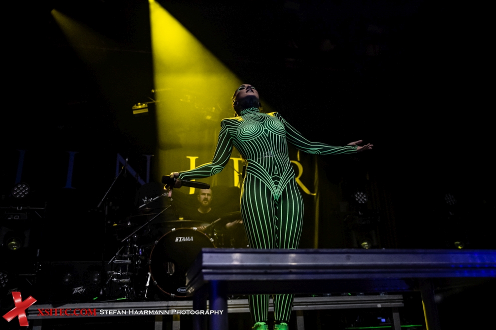 Nach kurzem Umbau wird es zunächst komplett dunkel auf der Bühne. Sekunden später zeigt sich, warum das so ist. Frontlady Tatiana Shmailyuk hat sich an diesem Abend in einen hautengen Jumpsuit gekleidet, der im Schein der nun aufleuchtenden UV-Lampen grünlich phosphoreszierend einen tollen Effekt liefert. Das zieht natürlich die komplette Aufmerksamkeit des Publikums auf sich, was den Bandkollegen ein in diesem Falle sogar explizites Schattendasein verordnet. „Who´s Gonna Be The One“ fegt durch die Halle und neben den exquisiten Lichteffekten überzeugen die Schattenmänner Roman Ibramchalilow (Gitarre), Eugene Abdjuchanow (Bass) und Vladislav Ulassewytsch (Schlagzeug) an ihren Instrumenten und sorgen so für die Basis dieser grandiosen Show.