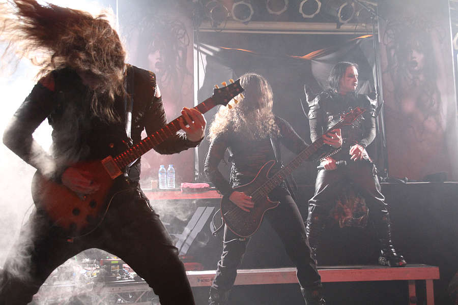Von BEHEMOTH erwartet man Perfektion, von BEHEMOTH bekommt man Perfektion. Trotzdem: man darf froh sein, die polnische Band wieder live erleben zu dürfen, denn nach der Leukämie-Erkrankung von Fronter Nergal herrschte lange Zeit Ungewissheit. Doch so abgedroschen es klingt, sie sind stärker als je zuvor zurückgekommen. Das neue Album "The Satanist" bietet einen um neue Einflüsse erweiterten Querschnitt durch das bisherige Schaffen der Band und ist deshalb ein Meisterwerk geworden. Zudem wartet es wieder verstärkt mit Black-Metal-Einflüssen auf, was sich wiederum in der Setlist des Abends niederschlägt. Neben fünf Tracks vom aktuellen Album gibt es eine Reise durch so gut wie alle Alben der nicht gerade kurzen Diskografie der Polen, so dass wirklich für jeden Fan etwas dabei ist. Nach dem Intro geht es erwartungsgemäß mit dem hymnischen "Blow Your Trumpets Gabriel" los, bei dem direkt CO2-Fontänen in die niedrige Hallendecke geschossen werden, die sich dann an der Decke in den Raum ausbreiten. Das ebenfalls neue, famose "Ora Pro Nobis Lucifer" wird - für Matrix-Verhältnisse ungewöhnlich - mit züngelnden Flammen untermalt. Der Auftritt macht auch sonst optisch viel her. Am Bühnenrand stehen aufwändig verzierte Mikrofonständer, Nergal sieht in seinem Outfit aus wie ein Hohepriester des Bösen und vor allem der bullige Basser Orion zieht mit seiner Uruk-Hai-Optik die Blicke auf sich. Trotzdem steht bei BEHEMOTH die Musik im Mittelpunkt und die wird, so weit es die Soundverhältnisse erlauben, perfekt dargeboten. "Conquer All" eröffnet den Marsch durch die verschiedenen Alben, da dürfen "Slaves Shall Serve" und "Christians To The Lions" nicht fehlen. Der Titeltrack des neuen Albums leitet ein Wechselspiel mit dem Vorgänger und Hitalbum "Evangelion" ein, es folgt "Ov Fire And The Void", bevor man die Bühne das erste Mal verlässt. Natürlich wird man für Zugaben zurückgerufen, dem rasenden "Furor Divinus" folgt "Alas, Lord Is Upon Me". Mit "At The Left Hand Ov God" wird das "The Apostasy"-Album gewürdigt, zum Abschluss gibt es nochmal Flammen und den Hit "Chant For Eschaton". Doch auch damit noch nicht genug, das Finale wird mit dem opulenten "O Father O Satan O Sun!" bestritten.