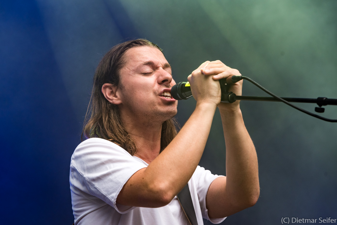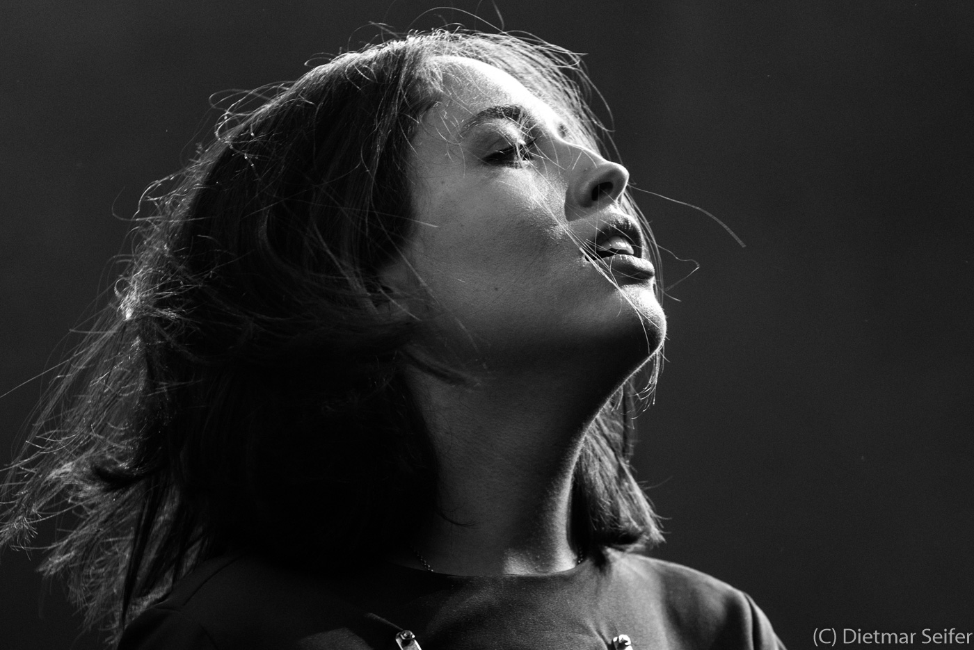 Headliner am Donnerstag, meinem ersten Tag, war sicher die deutsch-britische Popmusikerin Alice Merton, die aktuell mit „No Roots“ unter den ersten 30 in den deutschen TOP 100 Charts vertreten ist. In einem selbstdesignten und hochgeschlitzten roten Kleid, mit einer großen ebenfalls roten Schleife auf dem Rücken und einer vorne angenähten Metallapplikation, die stark an meine frühen Versuche mit Fischer Technik erinnerten, fiel sie neben ihren dunkel gekleideten Bandmitgliedern nicht nur durch Ihre Stimme auf. Nein, sie hat auch, im Gegensatz zu anderen Künstlern, den Soundcheck selber durchgeführt.