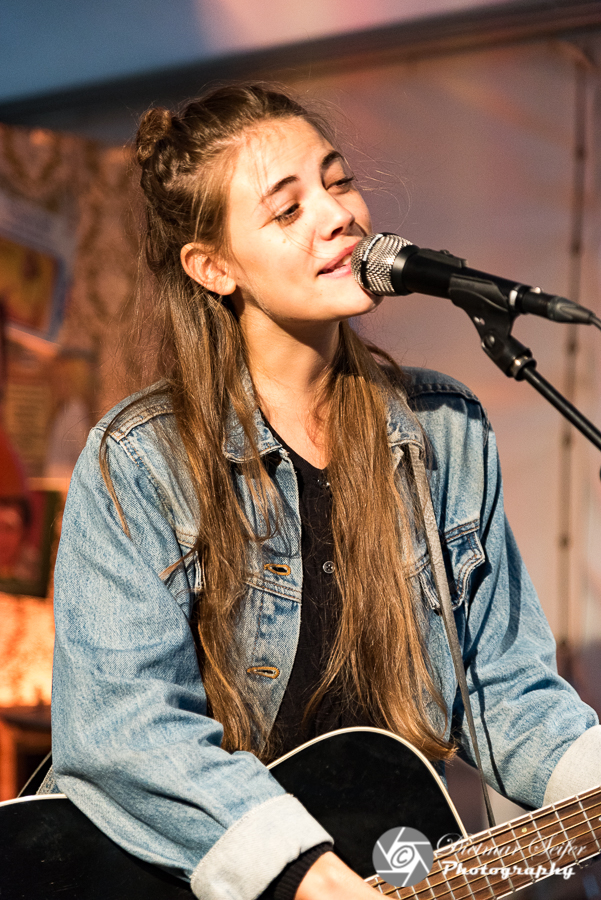 Da ich noch etwas Zeit hatte, bin ich an einer Special-Location vorbeigegangen, der „Wohnzimmerbühne Harmoniestraße“. Dort spielte gerade „Fee.“. Es sind melancholische und eigenwillige, tiefe und schöne Lieder, die die junge Singer-Songwriterin aus Frankfurt am Main schreibt. Nonchalant und direkt erzählt sie in ihren Liedern von der Suche nach dem richtigen Platz im Leben, nach Haltungen zur Welt, von Liebe und Selbstbehauptung. Momentaufnahmen nennt sie ihre Texte. „Ein Foto ist ein Foto. Auch wenn man sich nachher wünscht, man hätte darauf gelächelt.“