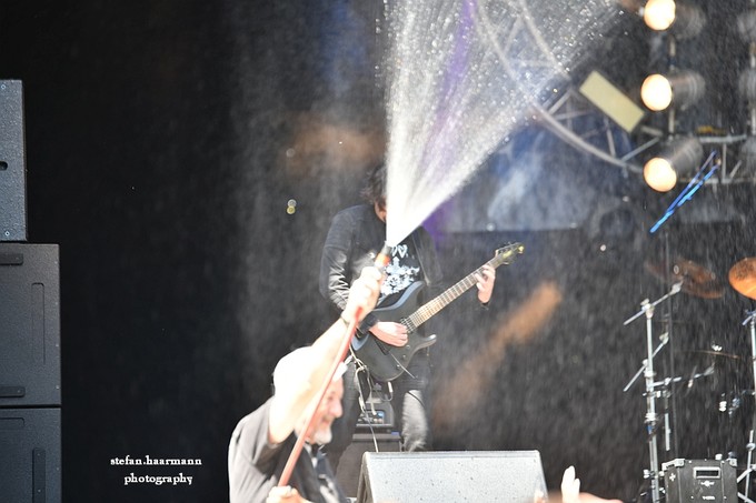 Patron Michael Bohnes lässt es sich nicht nehmen, der schwitzenden Meute in den vorderen Reihen ein ums andere Mal fein versprühten Wassernebel zu verabreichen, was bei der immer noch starken Sonneneinstrahlung ausgesprochen dankbar angenommen wird.