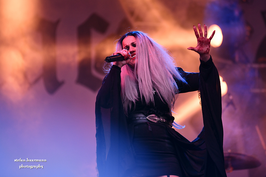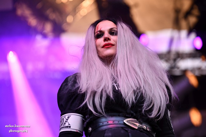 Zum Abschluss des Festivals geht es dann schminktechnisch noch einmal in die Vollen, denn mit LACUNA COIL betreten die Mailänder um Frontgirl Cristina Scabbia die Bühne. Markenzeichen der Combo: Reichlich weiße Schminke in den Gesichtern von Basser Marco Coti Zelati, Gitarrist Diego Cavallotti und Schlagzeuger Ryan Blake Folden sowie Theaterblut an den Händen bei Co-Leadsänger Andrea Ferro und im Gesicht sowie an den Händen von Frontfrau Cristina Scabbia, das Ganze ist halt als Gesamtkunstwerk zu betrachten.