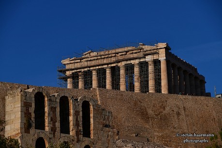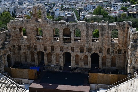 Ich nutze die Zeit, mich an diesem geschichtsträchtigen Ort etwas umzusehen. Oberhalb thront das im Abendlicht der untergehenden Sonne golden eingefärbte Wahrzeichen Athens: Die Akropolis. Direkt unterhalb der antiken Ruine befindet sich das Odeon, dessen Vorhof zu diesem Zeitpunkt schon stark besucht ist. Endlich kommt der Mann des Sicherheitsdienstes zurück und bittet mit hinein in die Katakomben, die sonst nur den Musikern und dem Personal zugänglich sind.