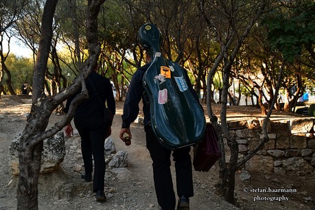 Die Steigung zum Odeon nehmen wir in Begleitung der ersten Musiker in Angriff, die sich mit Cello und Kontrabass den Anstieg hinauf quälen. Oben angekommen herrscht auf meine Nachfrage hin zunächst Ratlosigkeit. Der Briefkopf meines Begleitschreibens macht zwar gehörigen Eindruck auf den Mann der Security, aber wer nun zuständig ist, weiß er nicht. Immerhin nimmt er das Schreiben an sich und verschwindet in den Katakomben des Odeon.