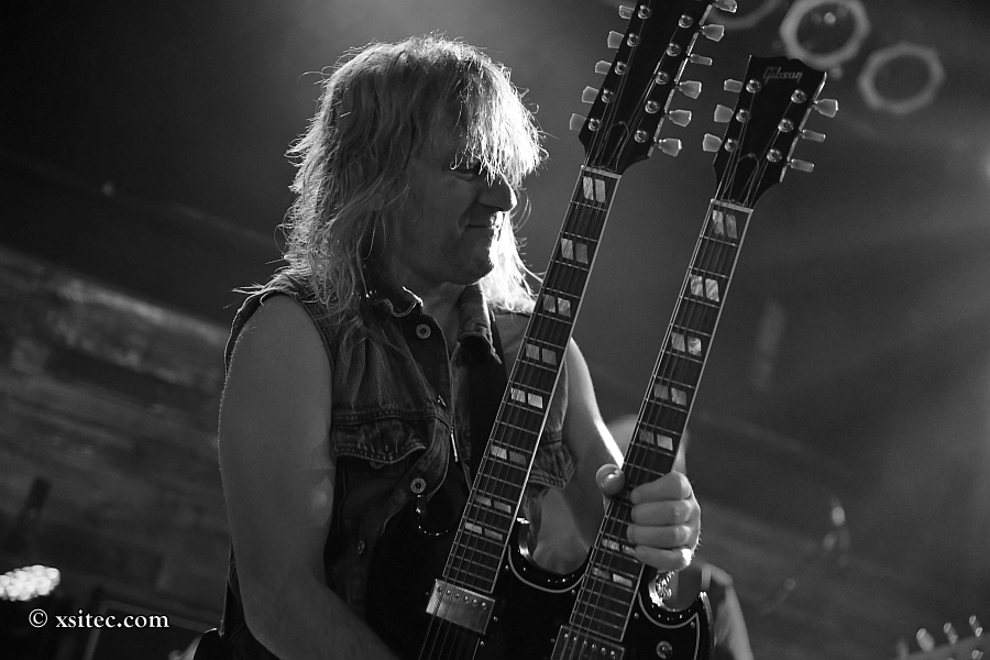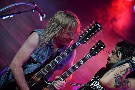 Selbstverständlich hat Leo Leoni auch seine geliebte GIBSON EDS-1275 mit im Gepäck, eine legendäre Gitarre mit zwei Hälsen, die es ihm ermöglicht, sein virtuoses Spiel auf 18 Saiten zu verteilen. Nach „Make My Day“ folgt mit „Mountain Mama“ ein GOTTHARD-Klassiker, ohne den dieser Abend nicht vorstellbar wäre. Leo Leoni bringt natürlich seine Talkbox zum Einsatz, mit der er das typisch verzerrte Intro erzeugt.