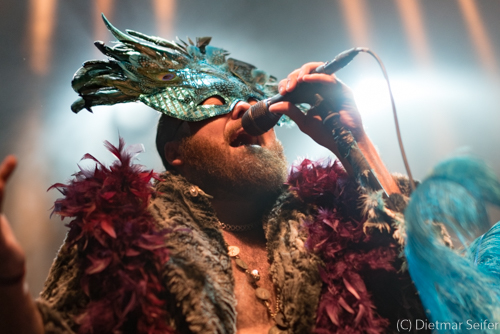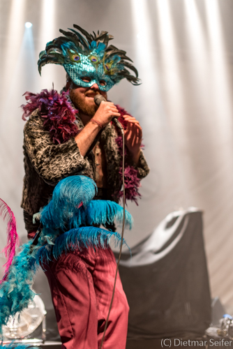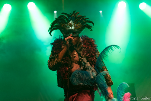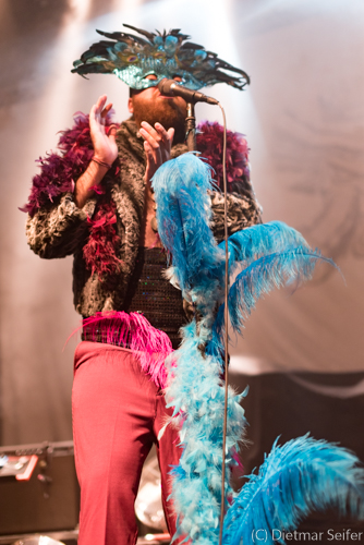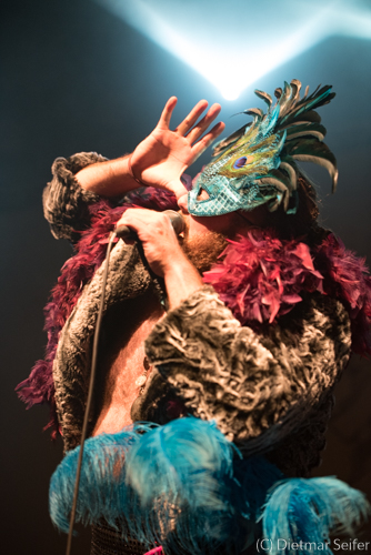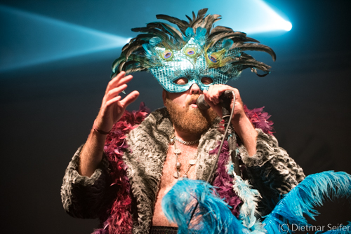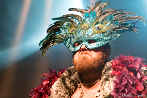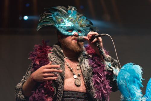 Das Bühnenoutfit des in Kanada geborenen Norwegers, der in Deutschland aufgewachsen ist, war schon sehr skuril. Geschmückt mit einer venezianischen Karnevalsmaske, die mit Pfauenfedern verziert war sowie Federboa und Bauchbinde, wirkte er wie ein Überbleibsel aus Casanovas Zeiten, wogegen er sich jedoch mit seiner Musik erfolgreich zu wehren wusste. Aber auch seine Bandkollegen waren mit einer grünen Gesichtsbemalung versehen und mit Panzerband verklebt.