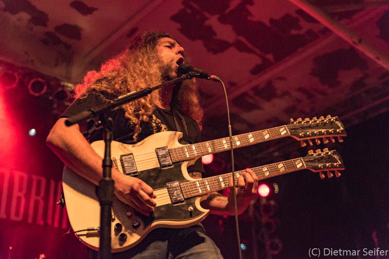 Da es ja schon technische Störungen gab, warum sollte es dann nicht so weitergehen? Während der ersten drei Stücke, genauer gesagt bei „Welcome Home“, wurde dann das Mikro von Claudio gewechselt, was dann zu Hälfte des Stückes dazu führte, dass dieses Stück von vorne begonnen wurde. Die Regel bei Konzerten besagt, dass die ersten drei Stücke fotografiert werden darf. Tja, und wenn das dann mit dem Zählen beim Security-Chef und dem Bandmanager nicht so richtig klappt, dann muss man halt, wie in diesem Fall, bereits zu Beginn der Wiederholung des zweiten Stückes den Fotograben verlassen. Das schränkt leider die Ausbeute der brauchbaren Fotos stark ein. (Anmerkung: „Keeping the Blade“ gehört nicht zu den ersten drei Stücken, da das Intro vom Band kommt.)