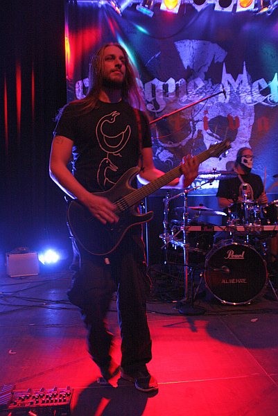 Zurück im Kulturbunker stehen als nächstes ALL WE HATE auf dem Programm. Bei denen spielt mit Pete Rode ein alter Bekannter der Kölner Metalszene Gitarre, vorher war er bei den nicht mehr existenten GUERRILLA tätig und in den 90ern spielte er mit Angela Gossow (heute ARCH ENEMY) bei ASMODINA (die der Verfasser dieser Zeilen auch noch live gesehen hat). Seit 2006 thrasht er also mit ALL WE HATE, die gleich aus mehreren Gründen eine der auffälligsten Bands an diesem Tag sind. Zum Beispiel wegen Gitarrist Dennis Busch, der zwar von der Statur her nicht gerade zu den Größten seines Fachs zählt, aber mit seinen Dreads, die von einem Bandana zusammengehalten werden und seiner Aktivität ziemlich charismatisch ist. ALL WE HATE spielen Thrash Metal der groovigen Art, angetrieben von tightem Riffing und gutem Songwriting, hier ist vor allem das starke "Sort Of Sickness" zu erwähnen. Auch haben ALL WE HATE mit Marc Schwarz einen ziemlich talentieren Shouter in ihren Reihen, der die Songs gekonnt veredelt. Darüber scheint er sich auch genauestens im Klaren zu sein, denn sein Selbstbewusstsein ist offenbar riesig. Das merkt man an Gestik und Mimik und dummerweise auch an seinen Sprüchen. "WIR sind Cologne Metal" wirkt einfach nur arrogant, richtig unsympathisch macht er sich aber mit seinem "Wo bleibt mein Bier? Wasser ist kein Metal. Scheiß Personal hier!"-Gepöbel. Das mag zwar lustig gemeint sein, aber lachen will so recht keiner drüber. Umso unverständlicher, dass ihm ein paar Zuschauer tatsächlich auch noch Bier zur Bühne bringen. Als dann später einige Biergläser vorne stehen, beschwert er sich auch darüber... Warum er im nächsten Leben Schlagersänger werden will, ist dem Berichterstatter wieder entfallen, zur Hälfte des Sets ist die Lust auf blöde Sprüche aber vergangen, so dass man sich auf die Dachterrasse verzieht. So verspielt man Sympathien, die man sich mit der Musik erspielt hatte.