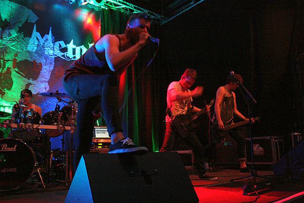 Weiter geht es mit CALIBER.X aus Hennef, die 2010 gegründet wurden und gerade ihre erste Platte "Suburbia" in Eigenregie veröffentlicht haben. Die Band spielt zeitlosen, schwer zu kategorisierenden Metal, der mal an neuere METALLICA, mal an TYPE O NEGATIVE und gesanglich auch mal an SYSTEM OF A DOWN erinnert. Auf der Bühne stechen vor allem Torsten, der charismatische Hüne von einem Sänger sowie der bullige Bassist Ole ins Auge, Drummer Fabes trägt zudem eine Skelettmaske, die sein Gesicht zur Hälfte bedeckt. Dagegen wirkt Gitarrist Bene regelrecht schüchtern. Von Anfang an hat die Band das Publikum gut im Griff und der angereiste Fanclub macht ordentlich Stimmung. Beim Song "Suburbia" gelingt es sogar, das Publikum dazu zu animieren, in die Hocke zu gehen und zusammen aufzuspringen. Doch auch mit ihrem energisch groovenden Sound sorgen CALIBER.X für gute Laune, zudem hat man ein gutes Händchen für funktionierendes Songwriting. Also auch hier: Daumen hoch.