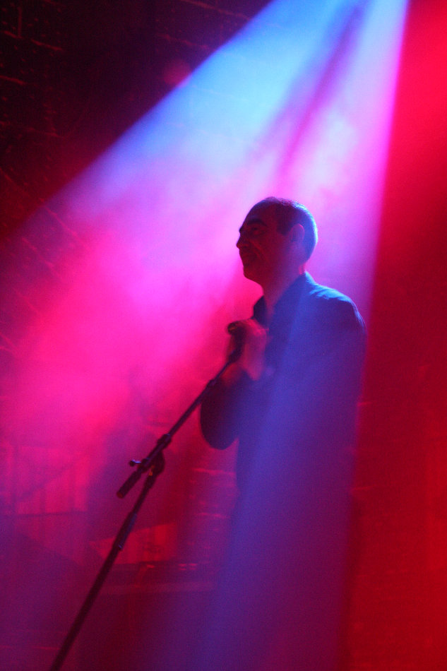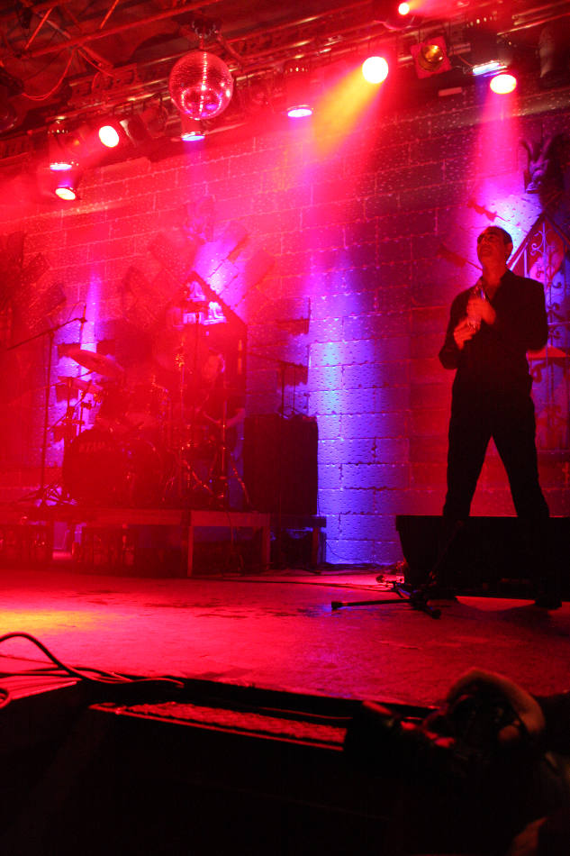 Die bei DAF nochmal aufgeräumter aussah, denn außer einem Schlagzeug und einem CD-Abspielgerät befand sich tatsächlich nichts mehr auf der recht hohen Bühne. Da das Pulp nicht nur von außen, sondern auch von innen wie ein mittelalterliches Schloss aufgemacht ist, wirkt das Gesamtbild seltsam: ein dürrer Gabi Delgado im Vordergrund, hinten nur die Drums und drumherum die altertümliche Optik, dazu erklang minimalistische Elektronik. Vor der Bühne tobte von der ersten Sekunde an der Mob im Pogo, denn DAF eröffneten ihren knapp 70 Minuten langen Set direkt mit ihrem Hit "Verschwende Deine Jugend". "Ich und die Wirklichkeit" folgte und zwei Songs später durften dann auch schon der Mussolini, der Adolf Hitler und der Jesus Christus getanzt werden, was sich das Publikum natürlich nicht zweimal sagen ließ. Nach "Ich will" stellte Gaby dann fest, dass seine Stimme schon so gut wie im Eimer war, was sich im Laufe des Abends natürlich nicht mehr zum Positiven veränderte. Allgemein machte Delgado nicht den fittesten Eindruck, wirkte aber offensichtlich sehr angetan von den Reaktionen aus dem Publikum und gab sich Mühe, Agilität zu zeigen. Homoerotisches bot er mit "Muskeln", bevor er sich erst einmal eine Flasche Wasser über den Kopf gießen musste.