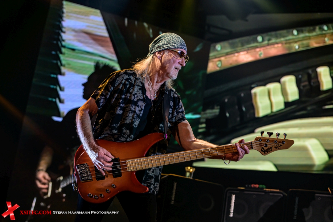 Somit ist alles perfekt angerichtet und nach kurzem Umbau stehen sie dann auf der Bühne: neben Ian Gillan (Gesang) greifen Ian Paice (Schlagzeug), Roger Glover (Bass), Don Airey (Keyboards), sowie der bereits erwähnte Neuzugang Simon McBride (Gitarre) zu den Instrumenten und legen nach „Mars, The Bringer Of War“ vom Band mit einer krachenden Version ihres Klassikers „Highway Star“ standesgemäß los. Auf der LED-Wall im Hintergrund gibt es zum Song passende Einspieler, die sich mit den von der Kamera am Bühnenrand eingefangenen Sequenzen der Hauptakteure abwechseln. Gleich darauf folgt mit „A Bit On The Side“ der erste Titel des seit Juli in den Läden stehenden, 23. Studioalbums der Briten, der bereits deutlich die Handschrift McBrides trägt, dessen Bandkollege Ian Paice ihn bereits vor seinem Einstieg bei DEEP PURPLE als einen der weltbesten Gitarristen bezeichnet hatte.