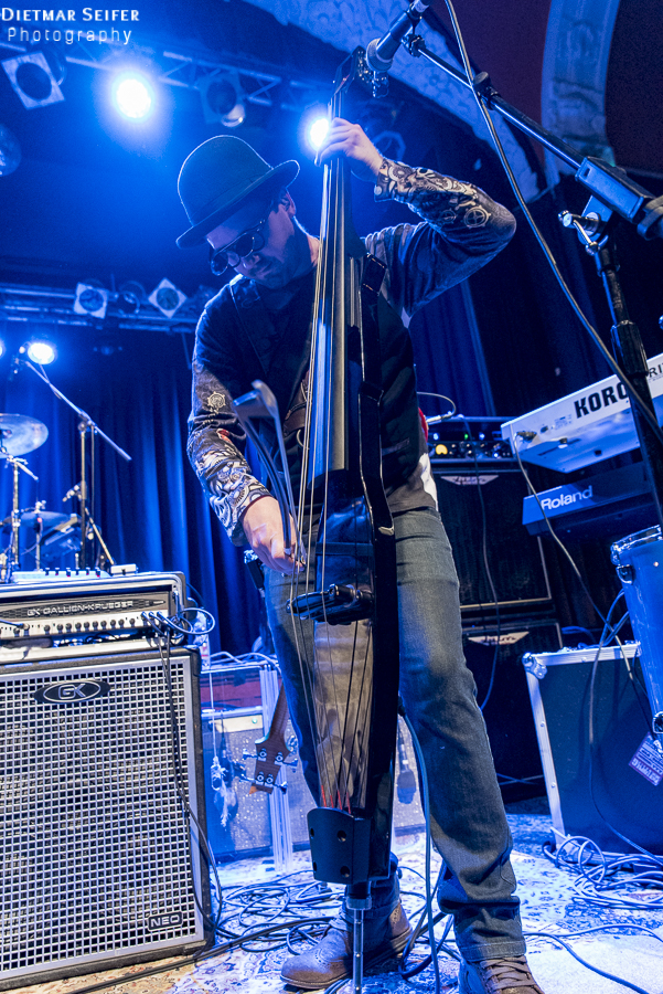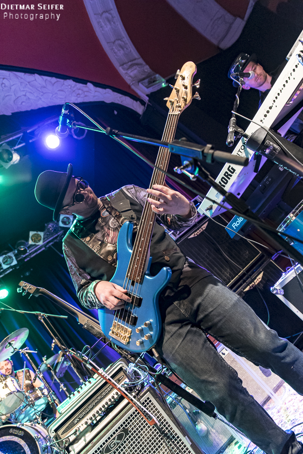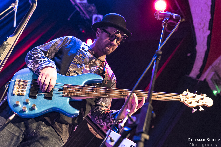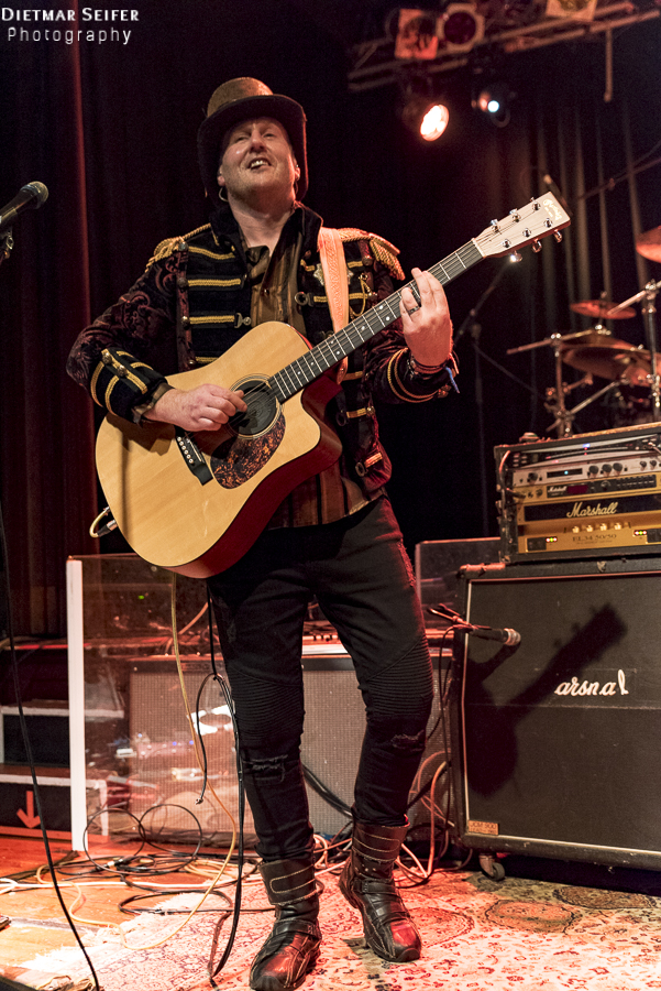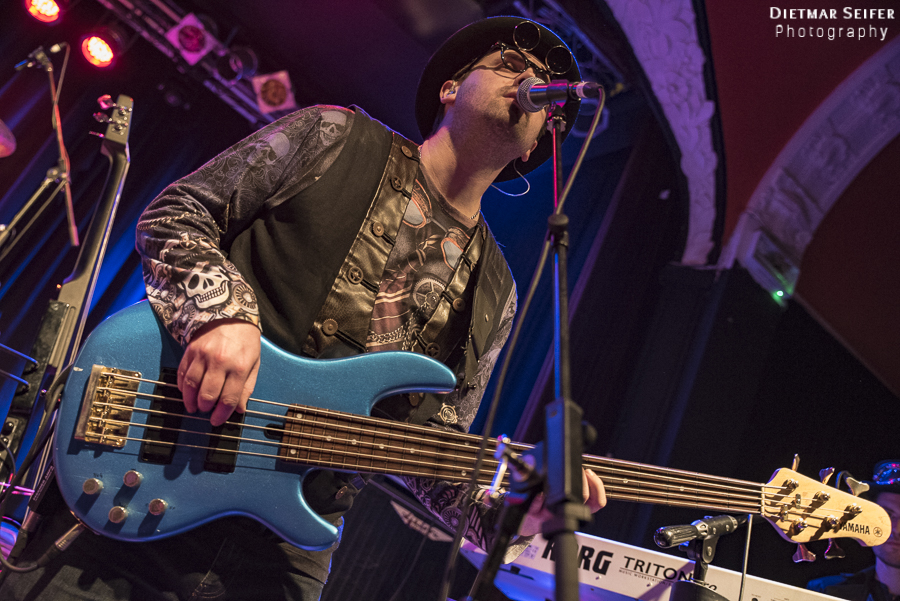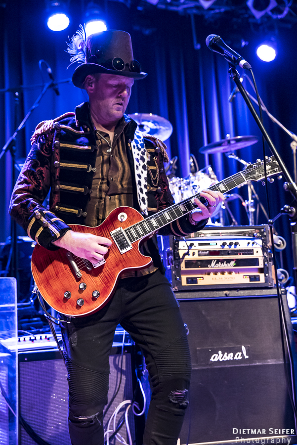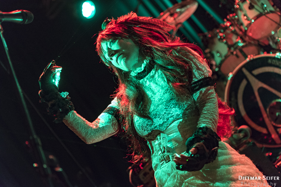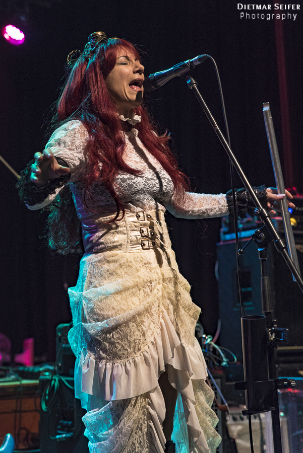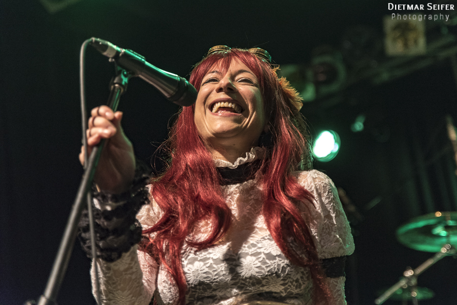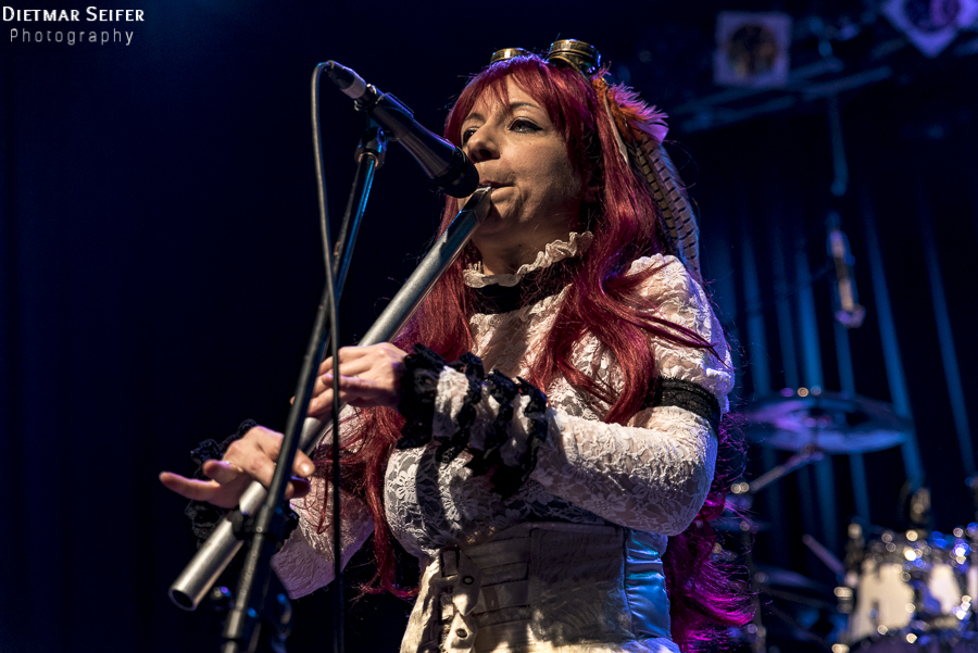 Doris Brendel ist eine aufregende Live-Sängerin, deren Band neben den musikalischen Qualitäten mit ausgefallenen Steam-Punk-Kostümen punkten kann. Die Frontfrau, deren Lebensmittelpunkt seit langem in London liegt, ist schon eine interessante Erscheinung, und das nicht nur wegen ihres weißen Spitzenkleides und den roten Haaren. Durch die Steam-Punk-Optik fühlte man sich irgendwie wie in einen Mad Max Film versetzt.
