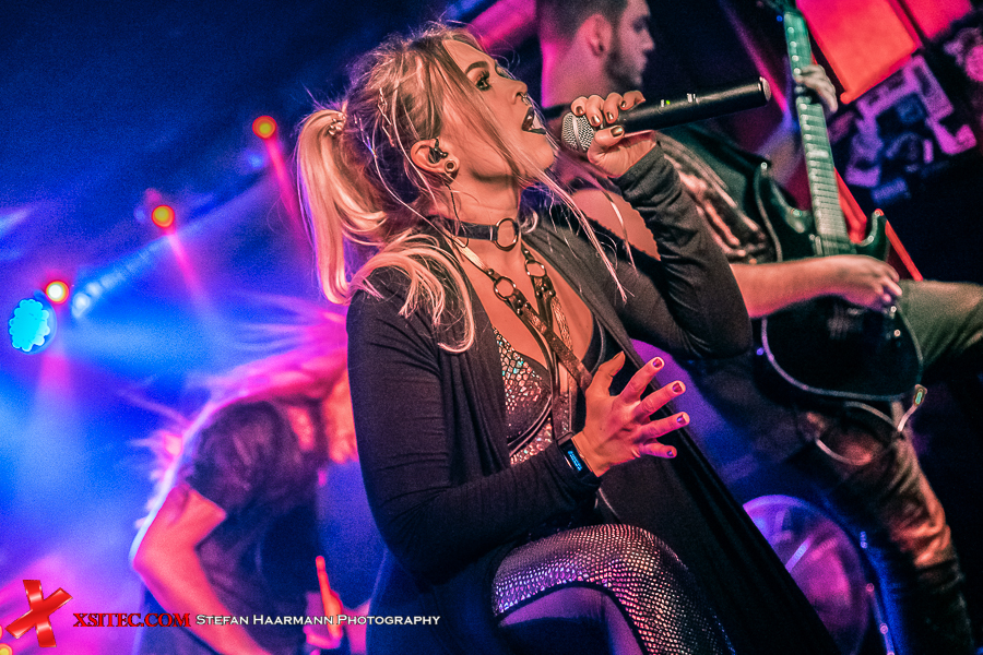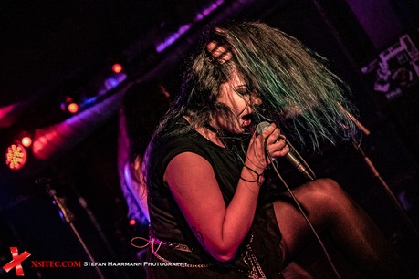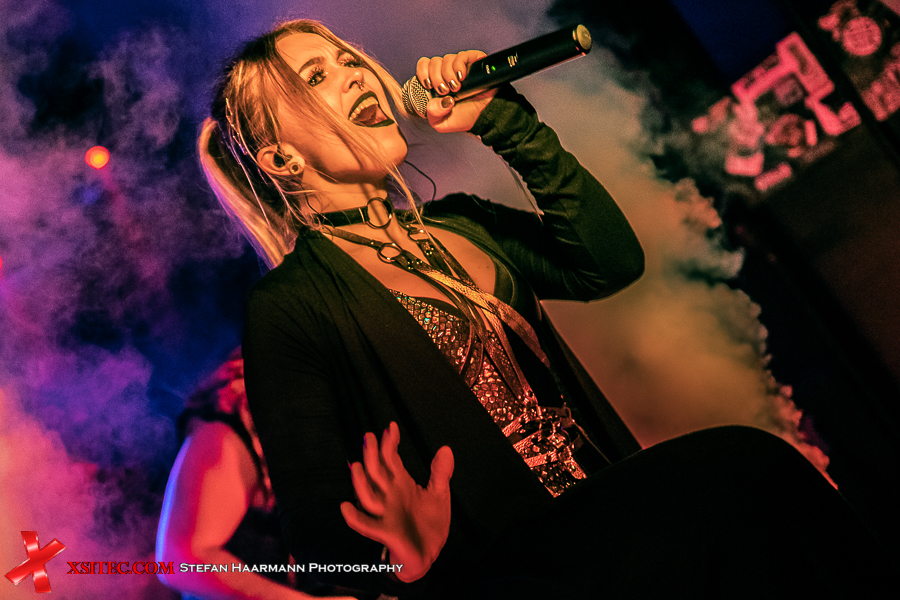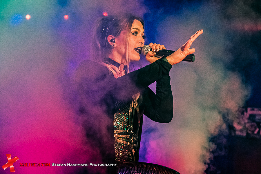 Danach wird die Bühne für ENEMY INSIDE hergerichtet. Im Background werden diverse LED-Säulen aufgebaut, am Bühnenrand gehen die Nebelkanonen in Stellung. Nach dem Intro, zu dem die Bühne direkt einmal vollständig eingenebelt wird, betreten Nastassja Giulia (Gesang), Evan K (Lead-Gitarre), Dominik Stotzem (Bass), Dave Hadarik (Rhythmus-Gitarre) und Felix Keith (Schlagzeug) die Bühne und rocken mit „Falling Away“ direkt amtlich los. Das Strobo-Gewitter erzeugt in Verbindung mit den wabernden Nebelschwaden eine unwirklich-surreale Atmosphäre, der Sound ist brachial, aber differenziert und für die Location perfekt abgemischt. Chapeau!