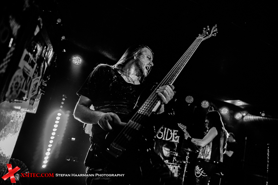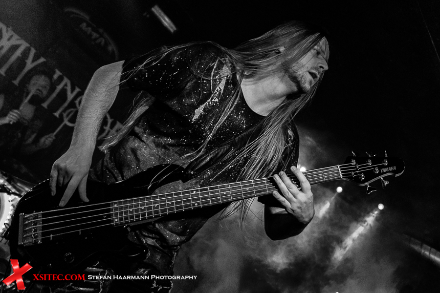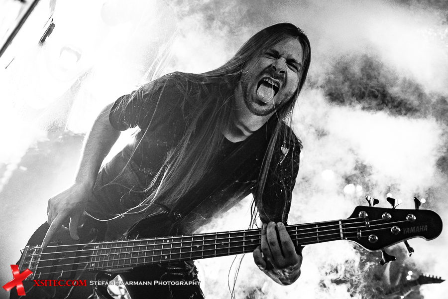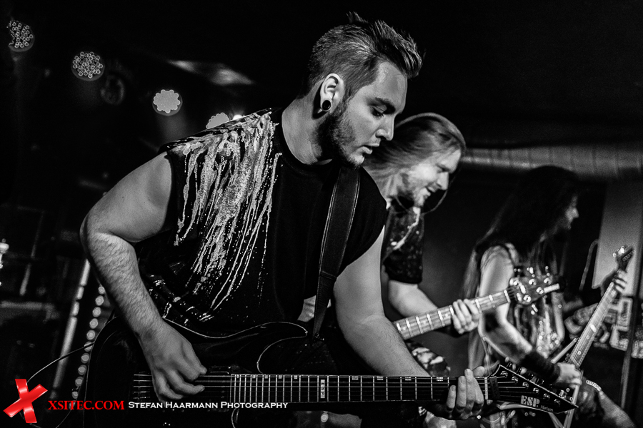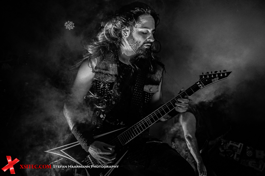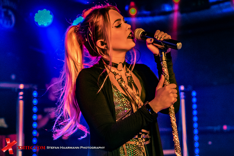 Nastassja Giulia würde in ihrem Outfit auch als Hollywood-Schönheit durchgehen, besticht aber so ganz nebenbei durch tollen Gesang und sympathische Bühnenpräsenz, mit der sie spielerisch das Publikum um den Finger wickelt. Links neben ihr bearbeitet Evan K den Sechsaiter mit enormer Vehemenz, während Basser Dominik Stotzem immer wieder seine Axt durch den Nebel schwingt und meiner Kamera die schönsten Grimassen zeigt. Weltklasse.
