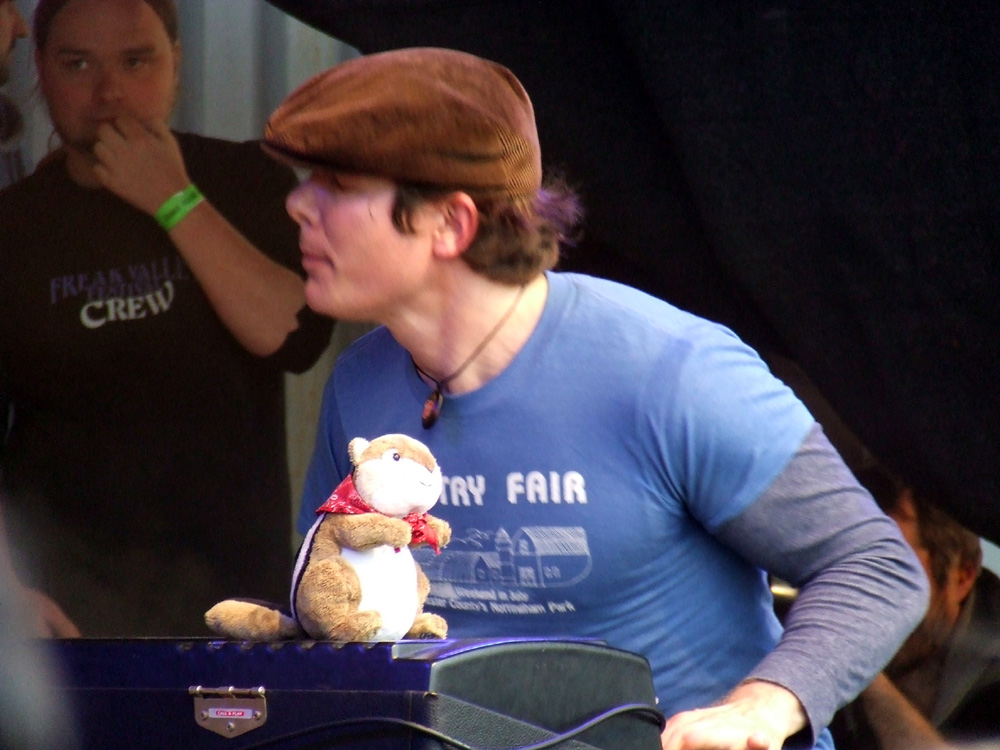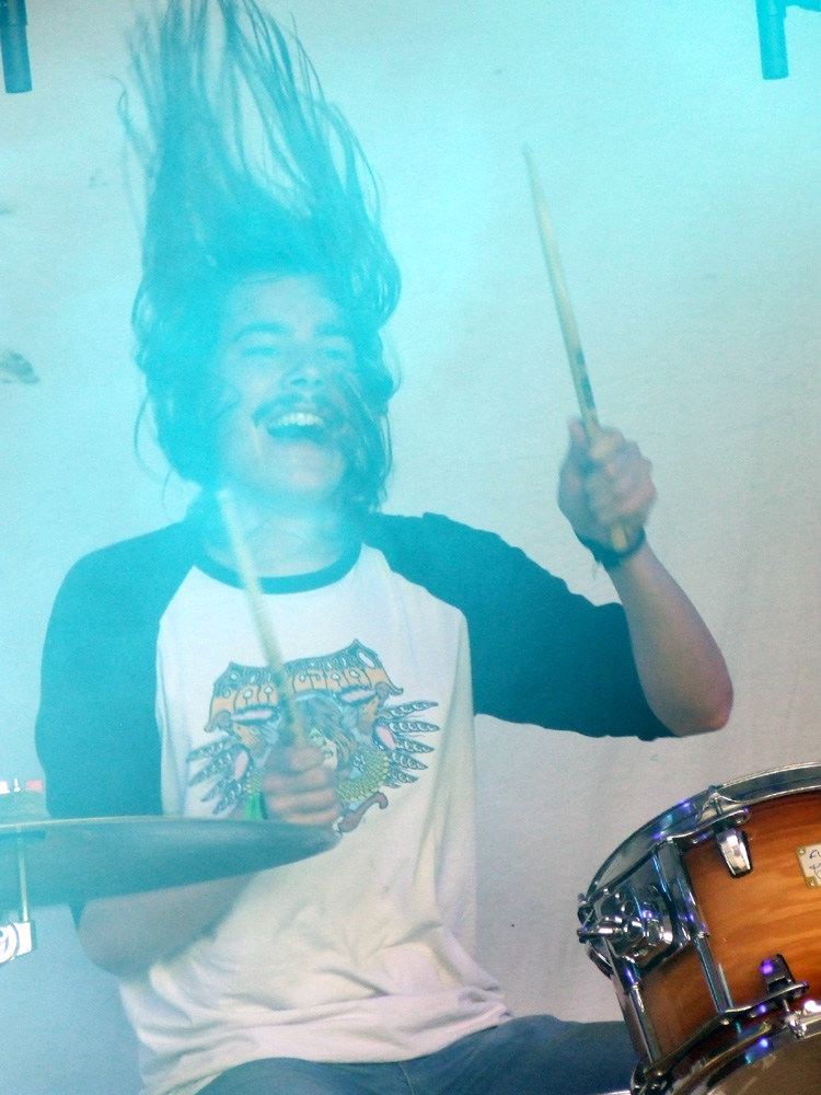 KATLA ist eine der Bands, wegen der ich angereist bin: Das extrem junge Quartett aus Stockholm hat nach einem raren Demo-Tape gerade seine erste Single veröffentlicht. Die Neugierde im Vorfeld wurde vor allem durch Videoclips von diversen Konzerten geweckt, unter anderem dem DunaJam 2011. Die Schweden erweitern das rockige Klangspektrum um Theremin wie Geige und strotzen vor Freude am Musizieren, gleichwohl ihnen die Festival-Atmosphäre anfangs Respekt abringt. Etwas schüchtern stehen die drei zunächst auf der Bühne (Drummer John sitzt natürlich), doch mit zunehmender Spieldauer verliert vor allem die wunderlich maskierte Lisa ihre Hemmungen: Die zierliche Dame erweist sich als Frontfrau mit ganz eigenen Manieren und trockenem Humor. Die musikalische Darbietung gerät wahrhaft psychedelisch und auf sympathische Weise verschroben, denn die Gruppe mäandert zwischen rockigen Stilrichtungen und anderen Klangwelten, ohne dabei ins allzu Gefällige abzudriften. Die beiden Namensvettern Nils an den Saiteninstrumenten legen sich nach einer Weile richtig ins Zeug, und der Gitarrist weiß anschließend nicht, ob es sich freuen oder traurig sein soll: „Das war das bislang größte Publikum, vor dem wir gespielt haben, und es hat so viele Spaß gemacht, dass ich die Bühne gar nicht mehr verlassen wollte…“ Auch der Rest der Band ist mit dem Gig zufrieden, den das Publikum mit deutlich mehr als nur Höflichkeitsapplaus bedenkt.