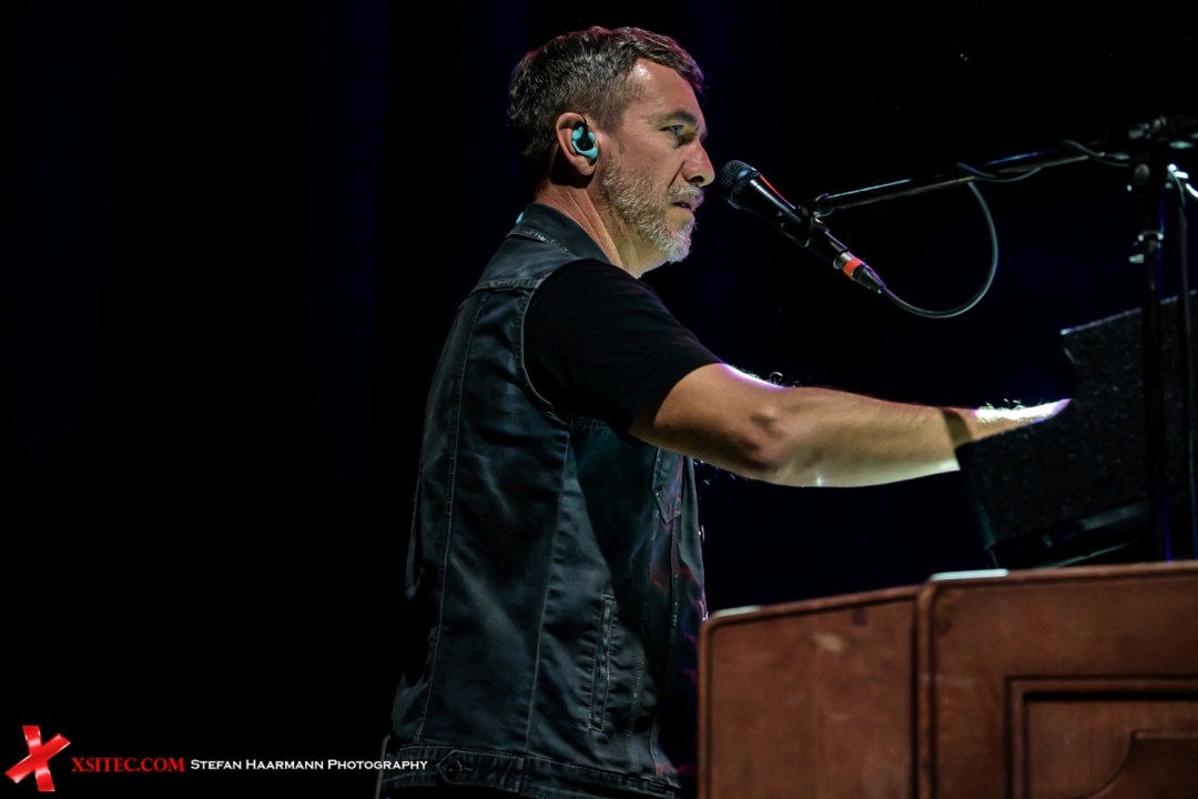 Schon mit den ersten Tönen des Openers „AI&I“ des aktuellen Albums „Stereo Crush“ ist die Stimmung der Fans, nach kurzer Abkühlung während der Umbaupause, wieder auf dem Siedepunkt. Nic Maeder, der Anfang der Woche von einer Virusinfektion aufs Krankenlager geworfen worden war, kommt mit Elan und sichtlich gut gelaunt auf die Bühne, flankiert von seinen formidablen Bandkollegen Leo Leoni (Gitarre), Freddy Scherer (Gitarre), Marc Lynn (Bass), Flavio Mezzodi (Schlagzeug) und Ernesto Gezzi (Keyboards).