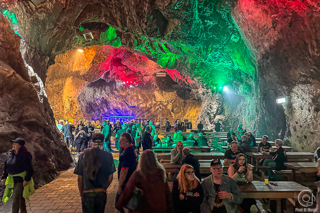 Wie in jedem Jahr hatten zu diesem Zeitpunkt die Vorbereitungen für das Festival im Folgejahr bereits längst begonnen. Das Line-Up für 2024 steht und so konnte man (und Frau) sorglos in den Festival-Abend starten. Wenn da nicht dieser vermaledeite Regen wäre. Tage zuvor hatte es immer wieder stark geregnet und wer sich etwas mit Geologie auskennt, der weiß, dass alles was oben auf den Berg draufregnet irgendwann unten in der Höhle ankommt.