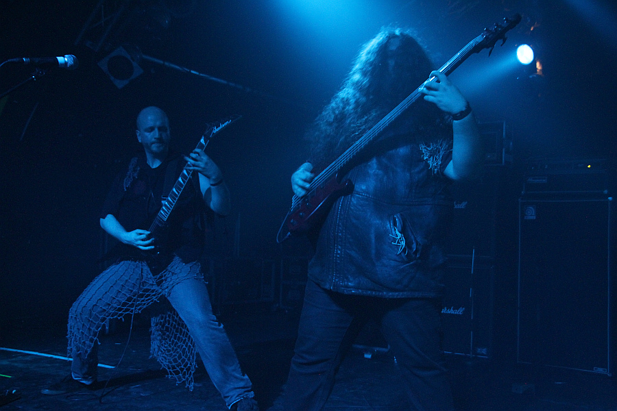 An diesem Samstag findet nicht nur das Hell Over Hammaburg statt, sondern auch eine Kundgebung zur Lampedusa-Problematik. Das sorgt für Staus rund um den Hamburger Hauptbahnhof und eine länger als geplant dauernde Anreise. Um 15.45 Uhr, also eine Viertelstunde vor Programmbeginn, steht man vor der Markthalle, die Abfertigung geht zum Glück zügig, so dass man rechtzeitig in der kleinen Marx steht, um BÖLZER zu sehen. Das Duo aus der Schweiz eröffnet das Spektakel in diesem Jahr und ist selber eine spektakuläre Band. Sänger und Gitarrist KzR ist ein echter Hüne mit dickem Rauschebart, hat das Mikrofon in bester Lemmy-Manier so hoch eingestellt, dass er beim Singen darunter hängt und hämmert mit Drummer HzR einen brutalen Mix aus Sludge und Black Metal in die Menge. Mit ihrer Debüt-EP "Aura" haben sich die Schweizer schnell Kultstatus erspielt und werden recht begeistert aufgenommen. In einfarbiges, dunkel eingestelltes Licht gehüllt, entfacht der rohe, derbe Sound eine eindringliche Wirkung und man fühlt sicht von dem mächtigen Inferno direkt zu Anfang ein bisschen überrollt. Insgesamt sieben Songs werden heruntergeholzt, also die drei vom Demo "Roman Acupuncture", die drei EP-Tracks sowie ein bislang unveröffentlichter. Sollte man mal gesehen haben.
