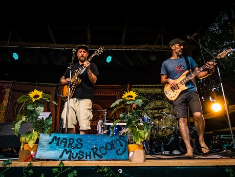 mars mushrooms Musiker und die Musiker der anderen Bands spielten Sets – Keyboard/ Orgel, Gitarre, Gesang und Didgeridoo – innerhalb der Sets der anderen Bands, was ihre Interchemie betonte und unter Beweis stellte, und die Sets jeder Band zu einem entfesselten Sturm der puren Chemie werden ließ. Vielleicht war es gerade das, was ein rhapsodisches Didgeridoo-Set möglich machte, oder wo eine Gitarre im Backstage-Zelt vorm Gitarren-Set lachend vergessen werden konnte. Solche Details taten das ihre, einfach das Gefühl der liebenswerten Wertschätzung im Publikum zu verstärken. Möglicherweise liege ich falsch in der Annahme, dass das Miteinanderspielen ein zentraler Bestandteil von Jambanding ist; wenn nicht, sollte es so sein. Eine weitere enorm wichtig Kleinigkeit war: Band-Sets hatten Pausen, was ideal zum Verschnaufen war – und als Crashkurs zum Akkorde-Einstudieren genützt werden konnte, wenn ein dritter und/oder vierter Impro-Gitarrist auf der Bühne benötigt wurde.