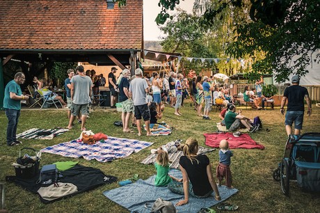 Adelmannsdorf bei Wolframs Eschenbach ist ein sehr kleines Dorf: „Alle“ – Einwohner, Familie, Freunde und Fans hatten mit angepackt, das Festival möglich zu machen. Jeder Besucher fühlte sich dadurch herzlich willkommen. Hier würde sicherlich die nächsten Tage niemand zum Außenseiter verkannt; Kinder jeden Alters spielten Beach-Fußball miteinander, Besucher, Einwohner und Crew vermischten sich zu einer kollektiven Synergie – es roch förmlich nach Urlaub. Ein weiteres wunderbares Detail war das Fehlen der Festival-typischen mobilen Örtlichkeiten – stattdessen gab es einen voll ausgestatteten Toiletten-Wagen, aufmerksam auf dem Weg zwischen Festivalgelände und Zeltplatz platziert.