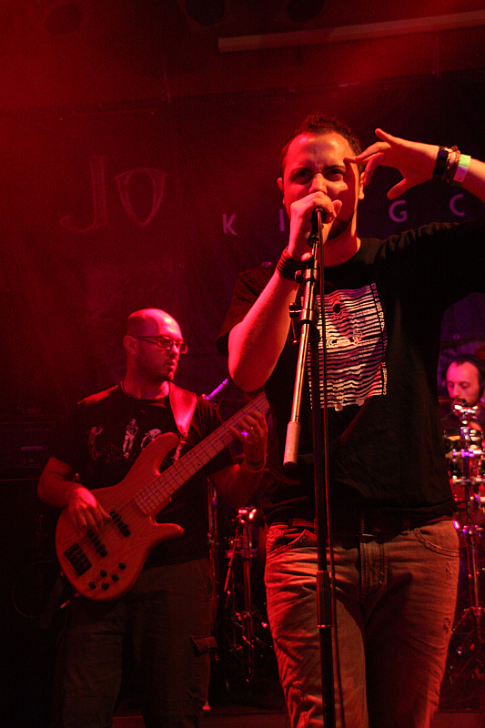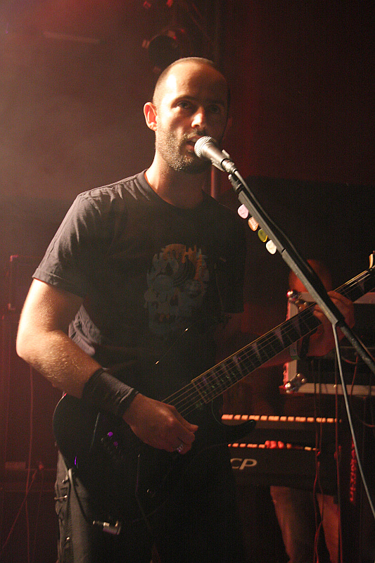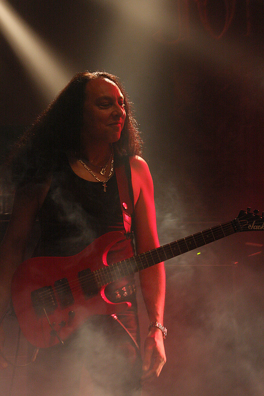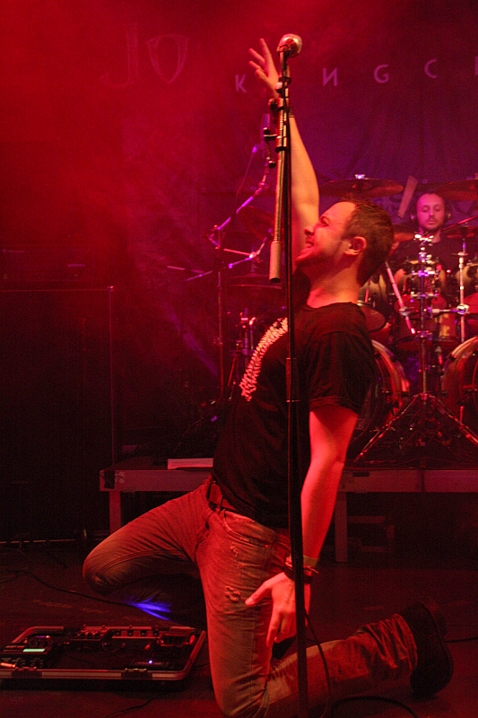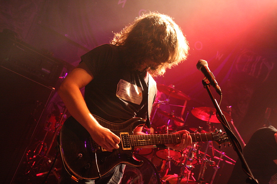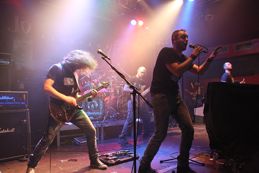 Auch der Name der zweiten Vorband ist nicht gerade geläufig, aber zumindest ein paar Leute können etwas mit KINGCROW anfangen, denn die haben schon einmal im Turock gespielt und zwar als Vorband von FATES WARNING. Die italienische Band nimmt die Show an diesem Abend für eine DVD-Veröffentlichung auf, was sich nicht als schlechte Wahl entpuppt, denn das Publikum spendet der Truppe reichlich Applaus. KingcrowMusikalisch wird nicht sonderlich harter, aber umso spannenderer, sehr atmosphärischer Progressive Rock geboten, bei dem nicht nur die spielerische Darbietung überzeugen kann, sondern auch das Material selber. Selbst wenn man die Band noch nie gehört hat, kann man sich schnell von ihr mitreißen lassen und so fängt man langsam an, den Abend auch zu genießen. Besonders gelungen sind die immer wieder einfließenden folkloristischen Elemente, die ein sehr mediterranes Flair haben und so dafür sorgen, dass man KINGCROW auch als überaus eigenständige Band im Gedächtnis behält. Optischer Blickfang auf der Bühne sind Gitarrist Diego Carfolla und Sänger Diego Marchesi, die mit viel Bewegung bei der Sache sind, Geschmack beweist der Sänger darüberhinaus mit seinem T-Shirt, dessen Motiv sich am Plattencover von JOY DIVISIONs "Unknown Pleasures" orientiert. Letztlich eine überaus gelungene Darbietung einer höchst interessanten Band, deren Name man sich als Liebhaber von kühlem Progrock unbedingt merken sollte.