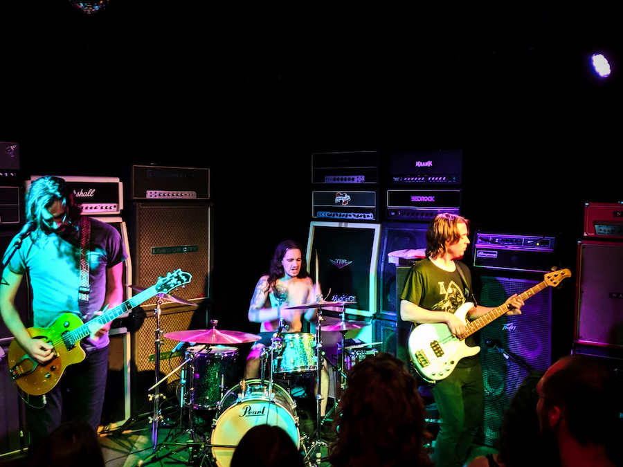 Das war auch besonders wichtig für die Hauptband des Abends: KING BUFFALO. Eine Band, die hier auf Musikreviews.de aufgrund ihres leicht aufgekommenen Hypes etwas kontrovers beleuchtet wurde. Deren Album ‚Longing to be the Mountain‘ ist zudem für mein Dafürhalten ein wenig zu schlecht weggekommen. Sei‘s drum, mir gefällt‘s sehr und deren Auftritt hat die Qualität ihrer Platte(n) nochmals ganz dick unterstrichen. Natürlich hat das Trio aus New York vornehmlich Songs ihres aktuellen Longplayers zum besten gegeben. Mittels sehr atmosphärischen, teils psychedelischen Sounds, gepaart mit Stoner-Einflüssen, baut King Buffalo eine bedrohliche Soundwand nach der anderen auf, um diese mit explosiven Gitarren wieder zum Einsturz zu bringen. Auch wenn sich im Laufe des Gigs eine Box verabschiedete und in den Basslagen zum Teil nur noch knarzende Geräusche von sich gab (man möge mir meine triviale Schilderung aufgrund meiner mangelnden Kenntnisse hier verzeihen), war dies nur eine nebensächlich zu betrachtende Störung. Der Auftritt der New Yorker wurde seitens des Publikums verdientermaßen mit den hierfür üblichen Reaktionen quittiert. Nach einer Zugabe war dann dieser durchweg gelungene Abend leider mal wieder viel zu schnell zu Ende.