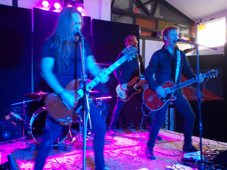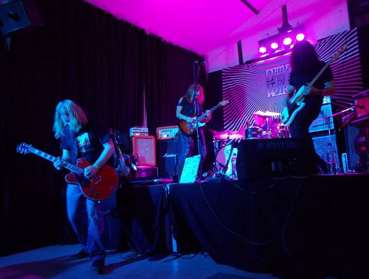Bei der Stoner-Rock-Band DRIVE BY WIRE aus den Niederlanden steht mit Sängerin Simone Holsbeek die einzige Frau am heutigen Tage auf der Bühne, was die Musikerin selbst verwundert. Mit dem neuen Album "Spellbound" hat das Quartett einige kleine Hits im Gepäck, doch wollen diese nicht so zünden, wie sich das die Band erhofft. Der Bass knarzt ganz wunderbar, die Gitarre ist zu leise, Simone lässt sich trotz zwei überschaubaren Reihen von Zuhörern die gute Laune nicht verderben, und Alwin Wubben nutzt den Raum vor der Bühne für einen Ausflug mit seiner Gitarre. Seine Verwendung einer Kölsch-Flasche zum Sliden auf dem Griffbrett dürfte als eine bemerkenswert sinnvolle Verwendung dieser sonst fragwürdigen Erfindung in die Geschichte der Do(o)mstadt eingehen. Auch bei DRIVE BY WIRE behält die Spielfreude die Oberhand, gleichwohl bereits während des Gigs klar ist: Hier wäre mehr drin gewesen.