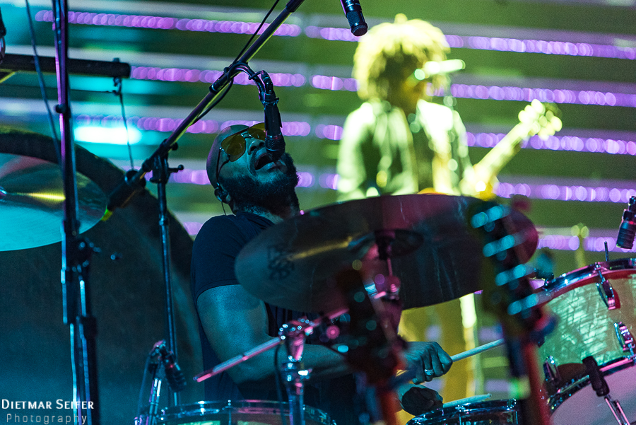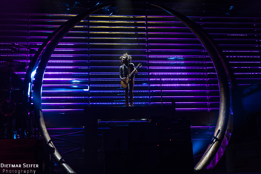 In stylischer Lederjacke, cooler Pilotenbrille und seinen wilden Dreadlocks groovte sich dann pünktlich ab 21:00 Uhr Kravitz mit seiner Bandfamilie durch den Abend in der mit ca. 7000 Zuschauern gefüllten LANXESS Arena in Köln.
