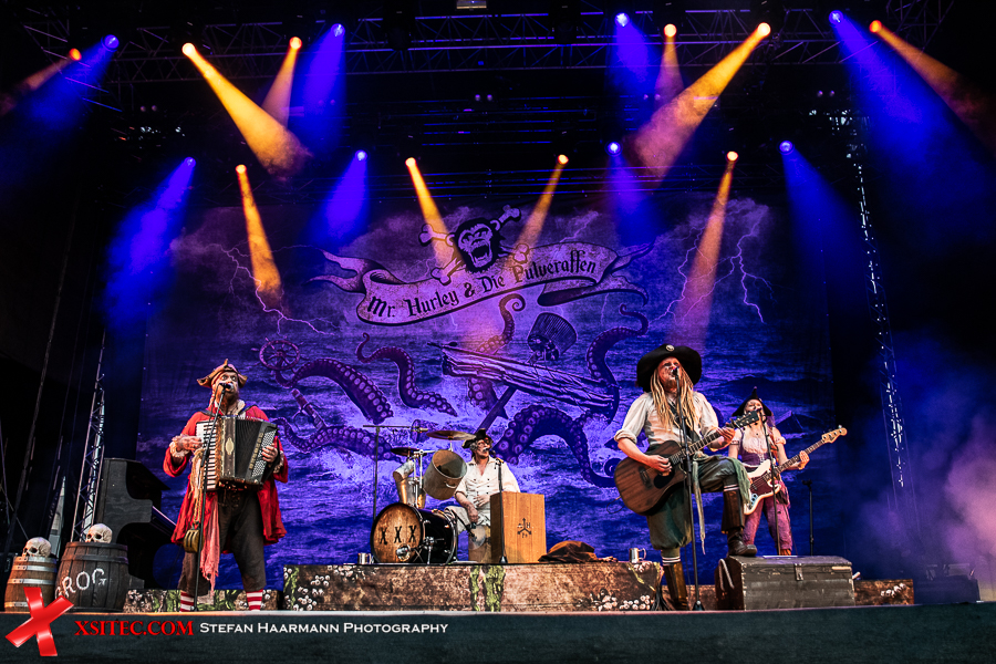 Nach kurzer Umbaupause, in der sich die Fans mit T-Shirts und Kaltgetränken eindecken, geht es mit MR. HURLEY & DIE PULVERAFFEN weiter. Die Party-Piraten spielen eigentlich fast an jedem Sommerwochenende im Rahmen der von Gisbert Hiller organisierten MPS-Tournee und sind daher besonders durch die infolge der COVID-19 Krise abgesagten Events betroffen. Umso frenetischer wird ihr Gang auf die Bühne hier in der Auto Arena gefeiert. In der ersten Reihe parkt ein Piratenbus, dessen Besatzung sich komplett in Piratenmontur geworfen hat, Augenklappen und aufgemalte Zahnlücken wie ihre Idole inklusive.