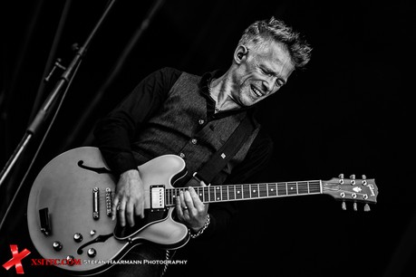 Bevor es losgehen kann, sind die Ordnungskräfte gefordert, den Autokorso in die vor der Bühne per Flatterband markierten Reihen zu lotsen. Das gelingt perfekt, der Parkplatz, den ich am heutigen Abend zugewiesen bekomme, gewährt aus fast zentraler Position perfekte Sicht auf den Schauplatz des Geschehens. Eine Überraschung erwartet die Zuschauer gleich zu Beginn, denn während die bisherigen Acts kein Merchandising verkaufen konnten, sorgen beide Bands durch einen Lagerverkauf vom Bollerwagen aus für Nachschub im Kleiderschrank. Ein Sonderlob für diese clevere Idee.