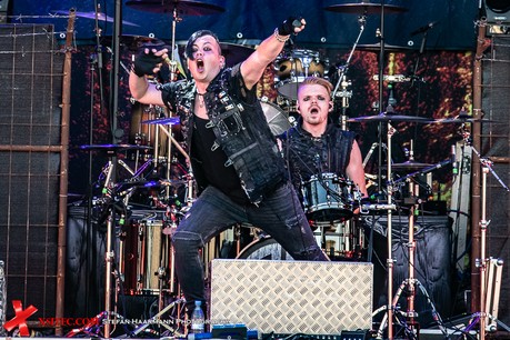 Dann aber ist es soweit und die selbsternannten Krieger des Mets machen sich daran, den Metnotstand ein weiteres Mal aktiv zu bekämpfen. Hauptmann Feuerschwanz und Prinz R. Hodenherz III springen wie wild über die Bühne, was wohl insbesondere durch die lange Konzertpause verständlich erscheint. „Metnotstand im Märchenland“, gefolgt von „Die Hörner hoch“ und „Wikinger Blut“ stellen die Weichen auf pure Ausgelassenheit und endlich wieder live zelebrierte Lebensfreude der Band aus Erlangen.