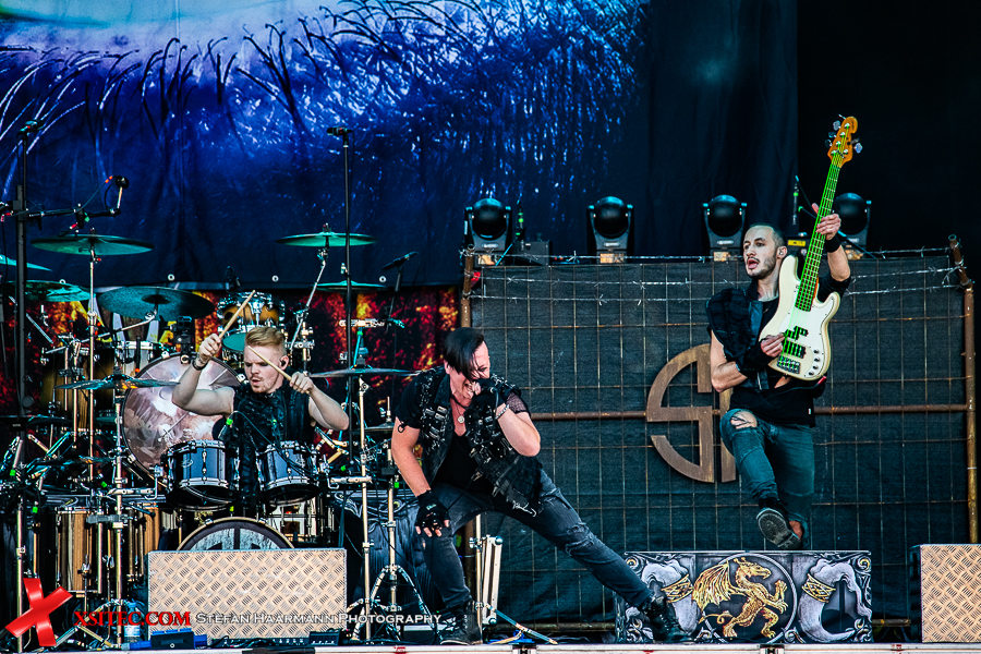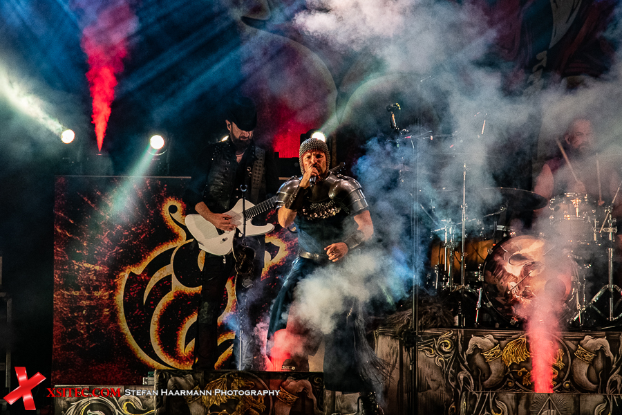 Für Tanzeinlagen und optische Highlights sorgt immer wieder die „Mieze“, die in wechselnden Kostümen den Rittern der Metrunde einheizt. „Schubsetanz“ vom 2018er Kracher „Methämmer“ wird vom Hauptmann und dem Prinzen selbstredend auch im Strandkorb abgefeiert, der extra zu diesem Zweck auf die Bühne gekarrt wird. „Prinzessin“, „Das Elfte Gebot“ und „Kampfzwerg“ heizen die Stimmung im weiten Rund weiter an, bevor mit „Ding“ die Coverversion des SEED Megahits ansteht, die in der Version der Feuerschwänze etwas metallischer, aber dennoch stimmig daherkommt. „Latte“ (Zitat Prinz R. Hodenherz III: „So richtig alte Scheiße“), „Operation Drachensturm“ sowie „Krieger des Mets“ beenden das reguläre Set, bevor FEUERSCHWANZ mit „Methämmer“, „Ketzerei“, „Malleus Maleficarum“ und „Unter dem Drachenbanner“ nochmals alle Register ihres Könnens ziehen