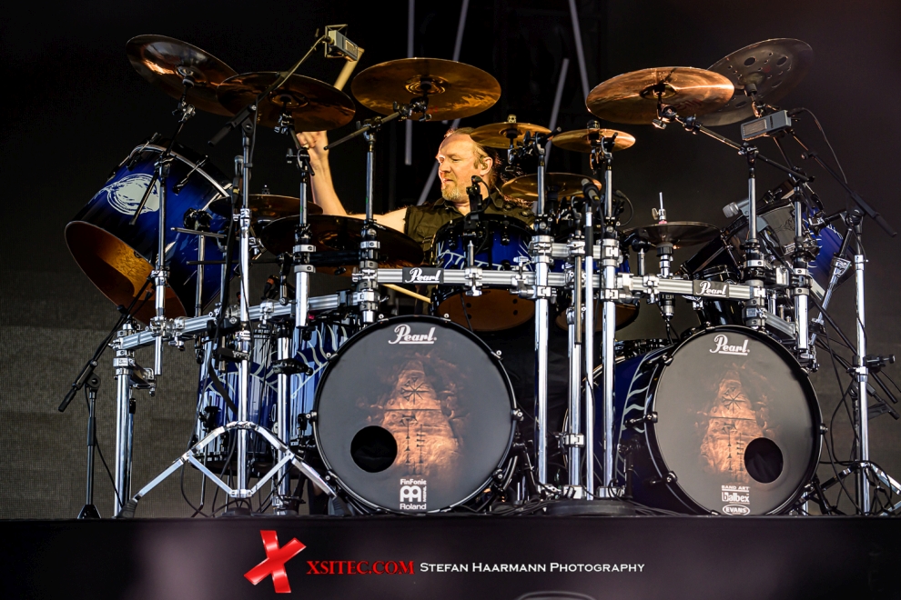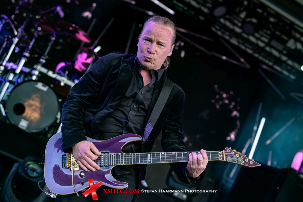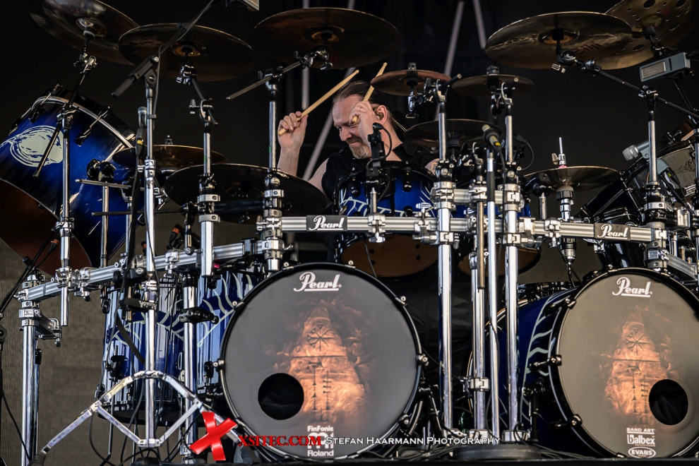 Den Abend eröffnen BLOODRED HOURGLASS, die zwar musikalisch weit entfernt sind vom Symphonic-Metal ihrer finnischen Landsleute um Floor Jansen, der von ihnen gespielte Groove-Metal kommt im weiten Rund des Amphitheaters allerdings ausgesprochen gut an und sorgt bei den aktiven Headbangern vor der Bühne bei hochsommerlichen Temperaturen für schweißnasse Leiber. Gute 45 Minuten reichen der Band locker, hier neue Fans zu gewinnen. Ein toller Auftakt. Die anschließende Umbaupause wird von allen Anwesenden zur Erfrischung genutzt, die immer noch starke Sonneneinstrahlung und die Restwärme des Betons fordern ihren Tribut.