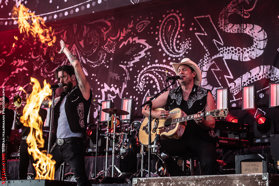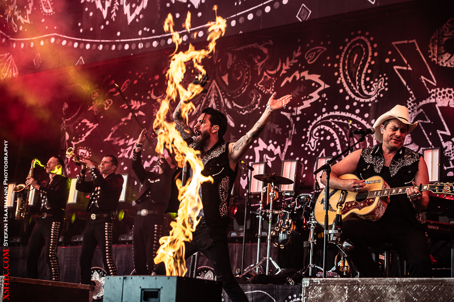 Im Anschluss lassen sich THE BOSS HOSS nicht lumpen und fackeln neben ihren großen Hits auch jede Menge brennbarer Flüssigkeiten ab. Ein Spektakel, insbesondere als Alec Völkel