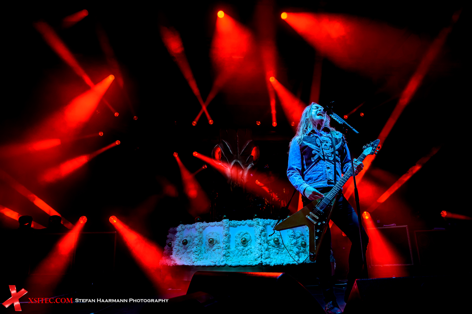 CHAPEL OF DISEASE werden anschließend als „beste Band des Tages“ anmoderiert, was den Jungs in der Anfangsphase des Konzerts sichtlich etwas Elan raubt, zu groß sind die Erwartungen der Fans im Amphitheater. Etwa zur Mitte des Konzerts zündet der Mix aus Metal, Prog und psychedelischen Elementen deutlich besser, während sich der Himmel über Gelsenkirchen in ein immer dunkler werdendes Grau wandelt, um sich kurz vor der Show der Altmeister DEMON in einem Wolkenbruch zu entladen. Ober-DEMON und einzig verbliebenes Gründungsmitglied Dave Hill kommt mit güldener Maske auf die Bühne, die er nach kurzer Zeit aber ablegt, um in der Folge einen Querschnitt durch die Hits aus 45 (!) Jahren Bandgeschichte zum Besten zu geben. „The Plague“, „Nowhere To Run“ oder „Don´t Break The Circle“ zeigen Hill in Top-Form, seine formidable Band trägt ein Übriges zum Gelingen der Show bei. Ein echtes Highlight des Finaltags.